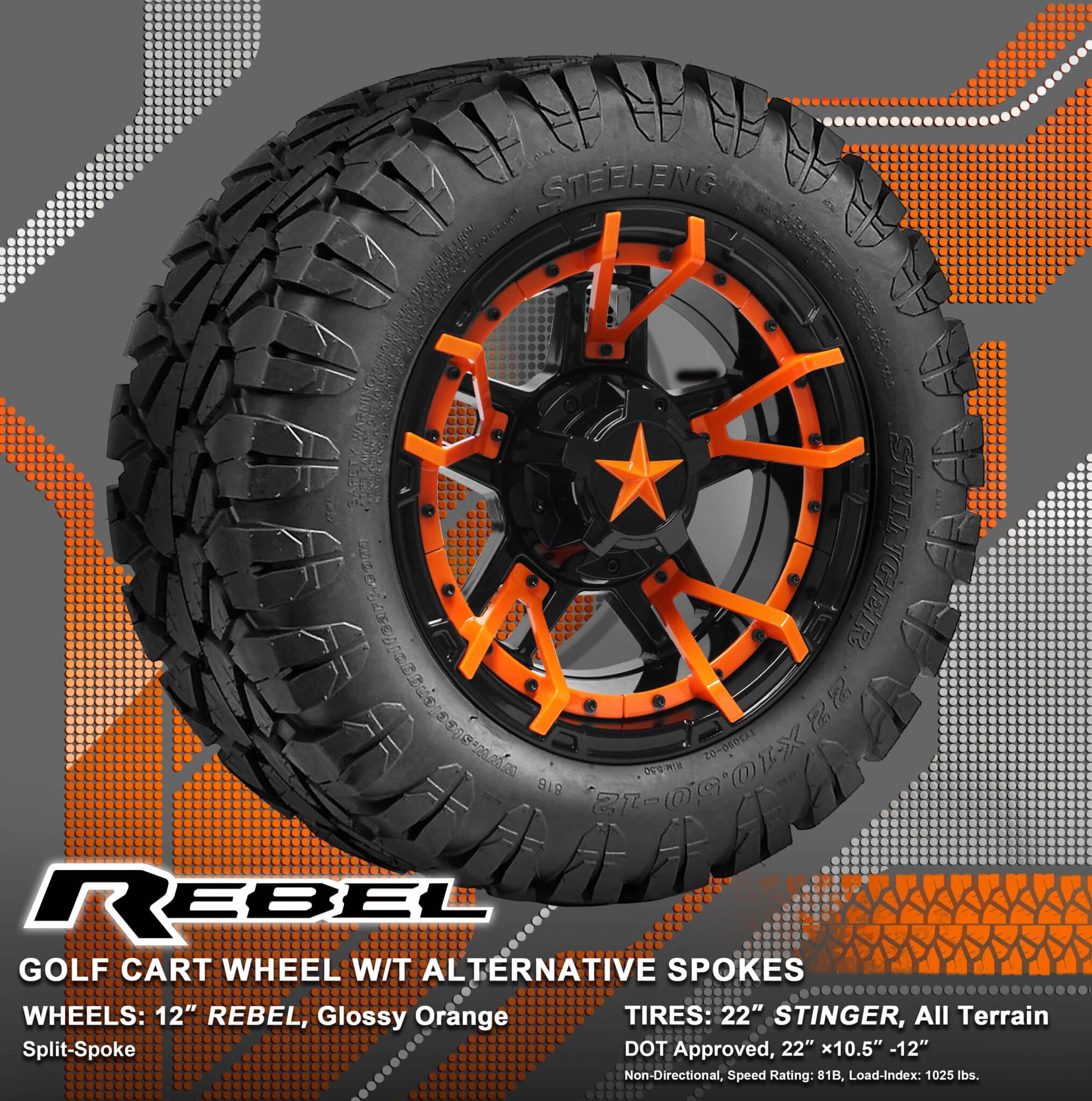 BNDL-TR1203-WH1251-WIRB33-LN0002 – SGC 12″ REBEL Glossy Black Wheel – Aluminum Alloy / STEELENG 22″x10.5″-12″ STINGER All Terrain Tire DOT approved / REBEL Inserts-Split Spoke-Glossy Orange