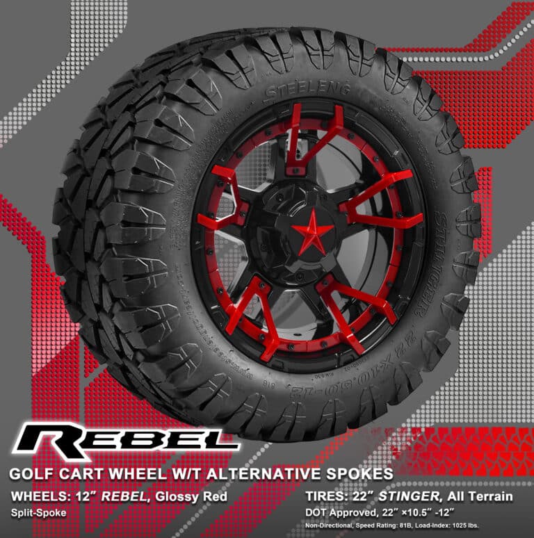 BNDL-TR1203-WH1251-WIRB34-LN0002 – SGC 12″ REBEL Glossy Black Wheel – Aluminum Alloy / STEELENG 22″x10.5″-12″ STINGER All Terrain Tire DOT approved / REBEL Inserts-Split Spoke-Glossy Red