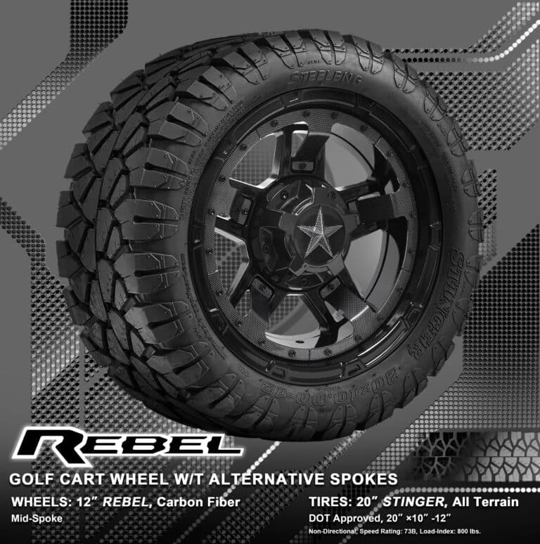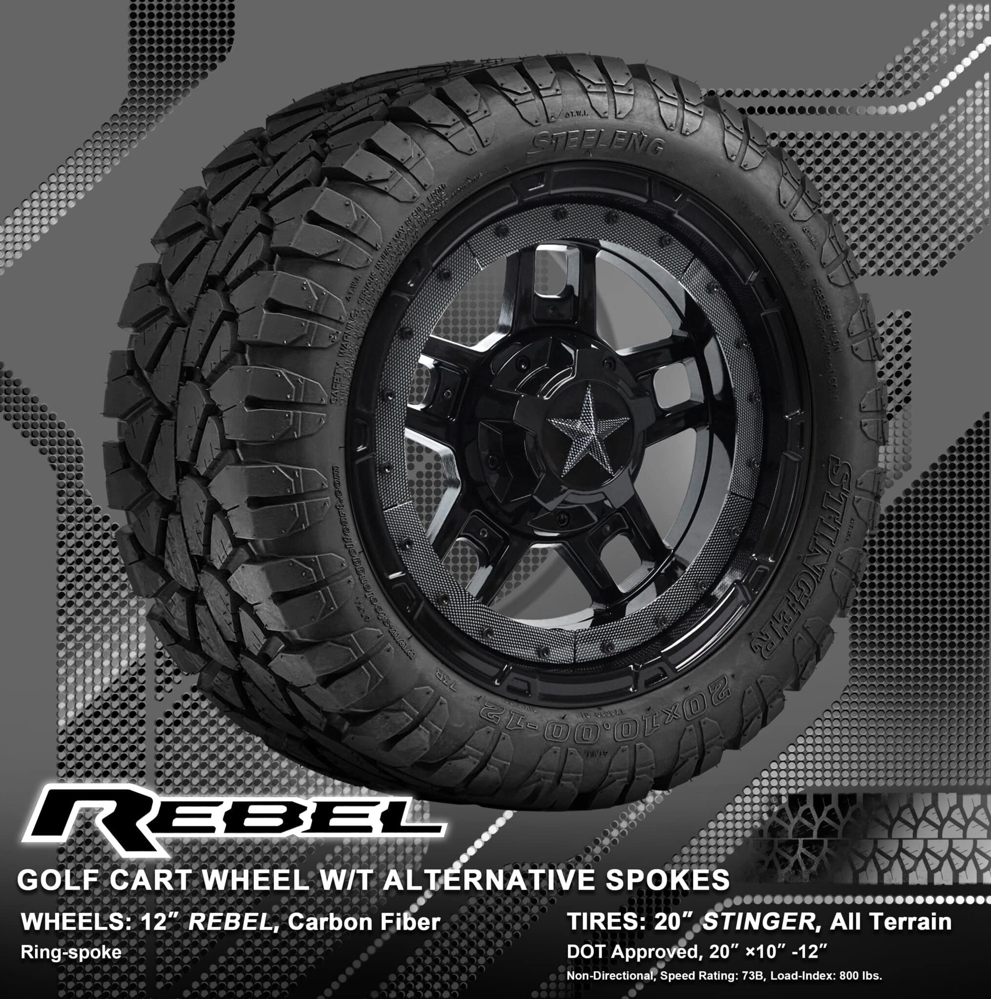 BNDL-TR1204-WH1251-WIRB01-LN0002 – SGC 12″ REBEL Glossy Black Wheel – Aluminum Alloy / STEELENG 20″x10″-12″ STINGER All Terrain Tire DOT approved / REBEL Inserts-Mid Spoke-Carbon Fiber