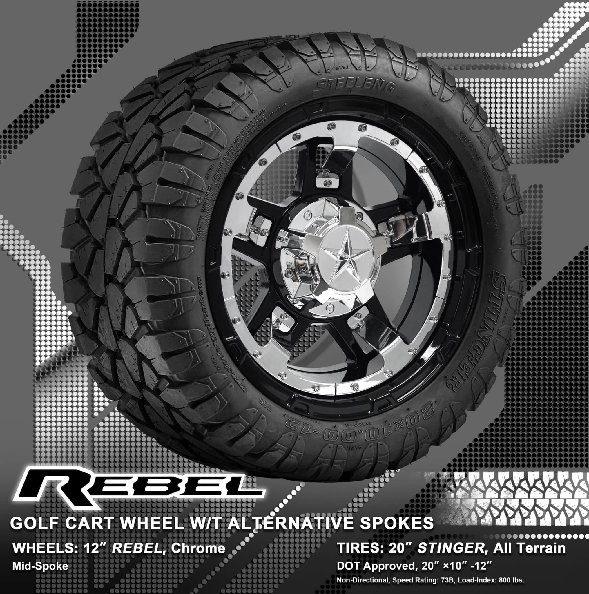 BNDL-TR1204-WH1251-WIRB02-LN0002 – SGC 12″ REBEL Glossy Black Wheel – Aluminum Alloy / STEELENG 20″x10″-12″ STINGER All Terrain Tire DOT approved / REBEL Inserts-Mid Spoke-Chrome