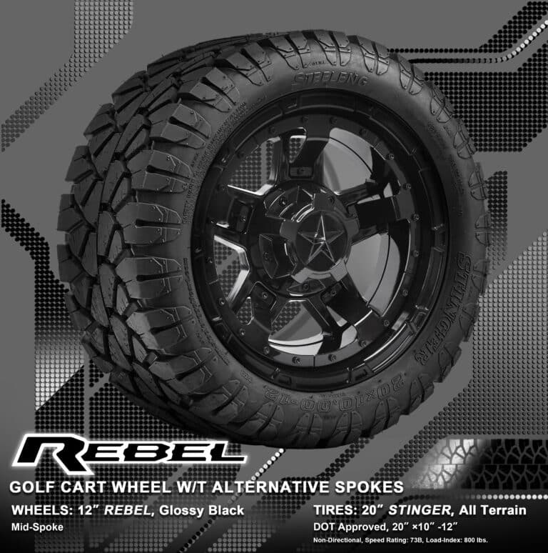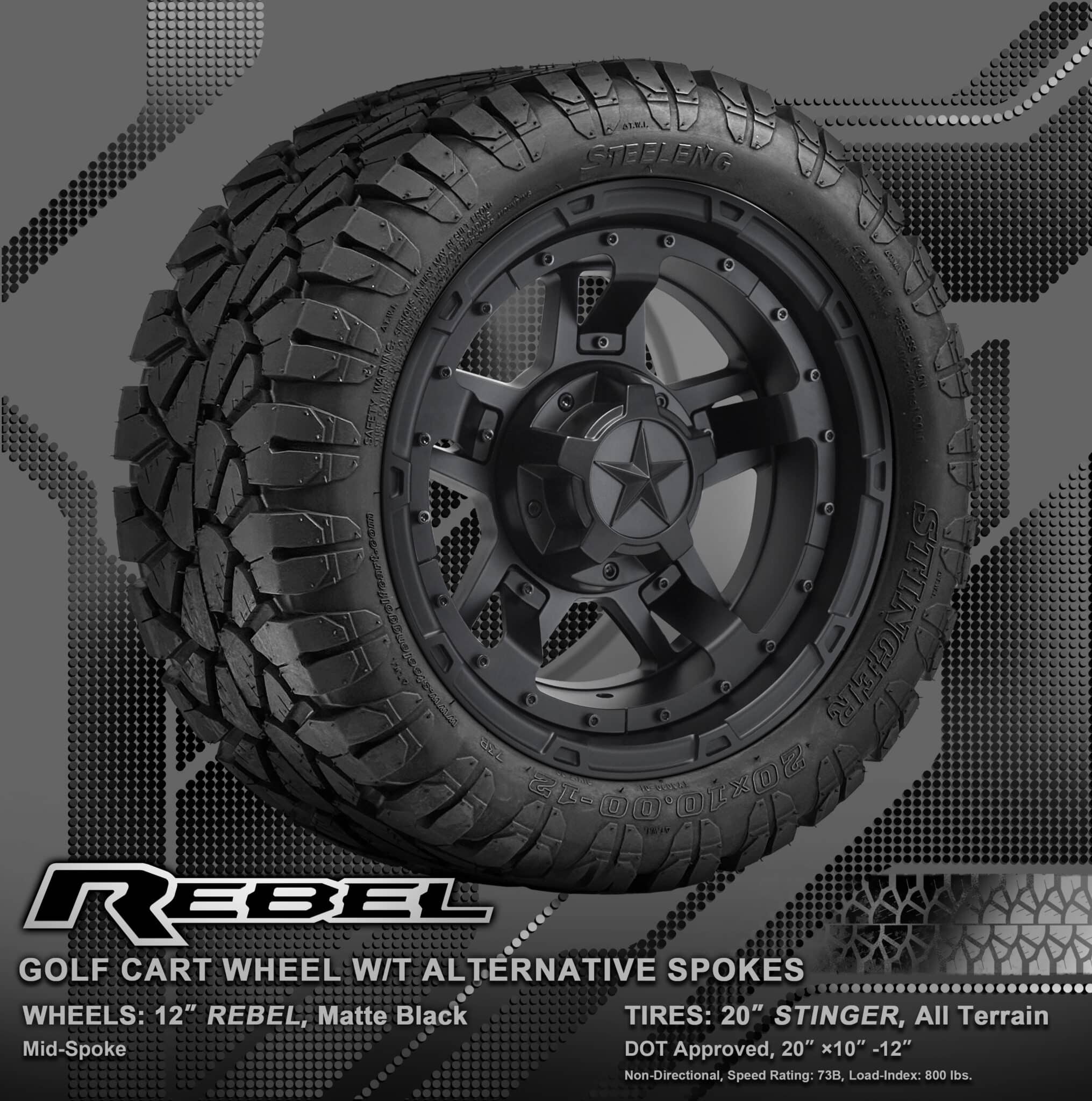 BNDL-TR1204-WH1251-WIRB13-LN0002 – SGC 12″ REBEL Glossy Black Wheel – Aluminum Alloy / STEELENG 20″x10″-12″ STINGER All Terrain Tire DOT approved / REBEL Inserts-Mid Spoke-Matte Black