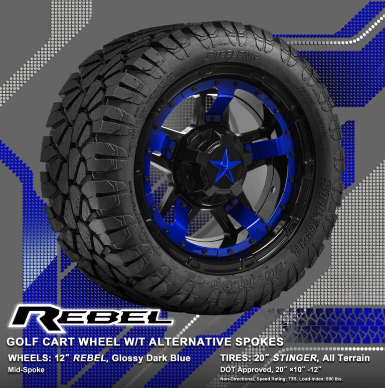BNDL-TR1204-WH1251-WIRB04-LN0002 – SGC 12″ REBEL Glossy Black Wheel – Aluminum Alloy / STEELENG 20″x10″-12″ STINGER All Terrain Tire DOT approved / REBEL Inserts-Mid Spoke-Glossy Dark Blue