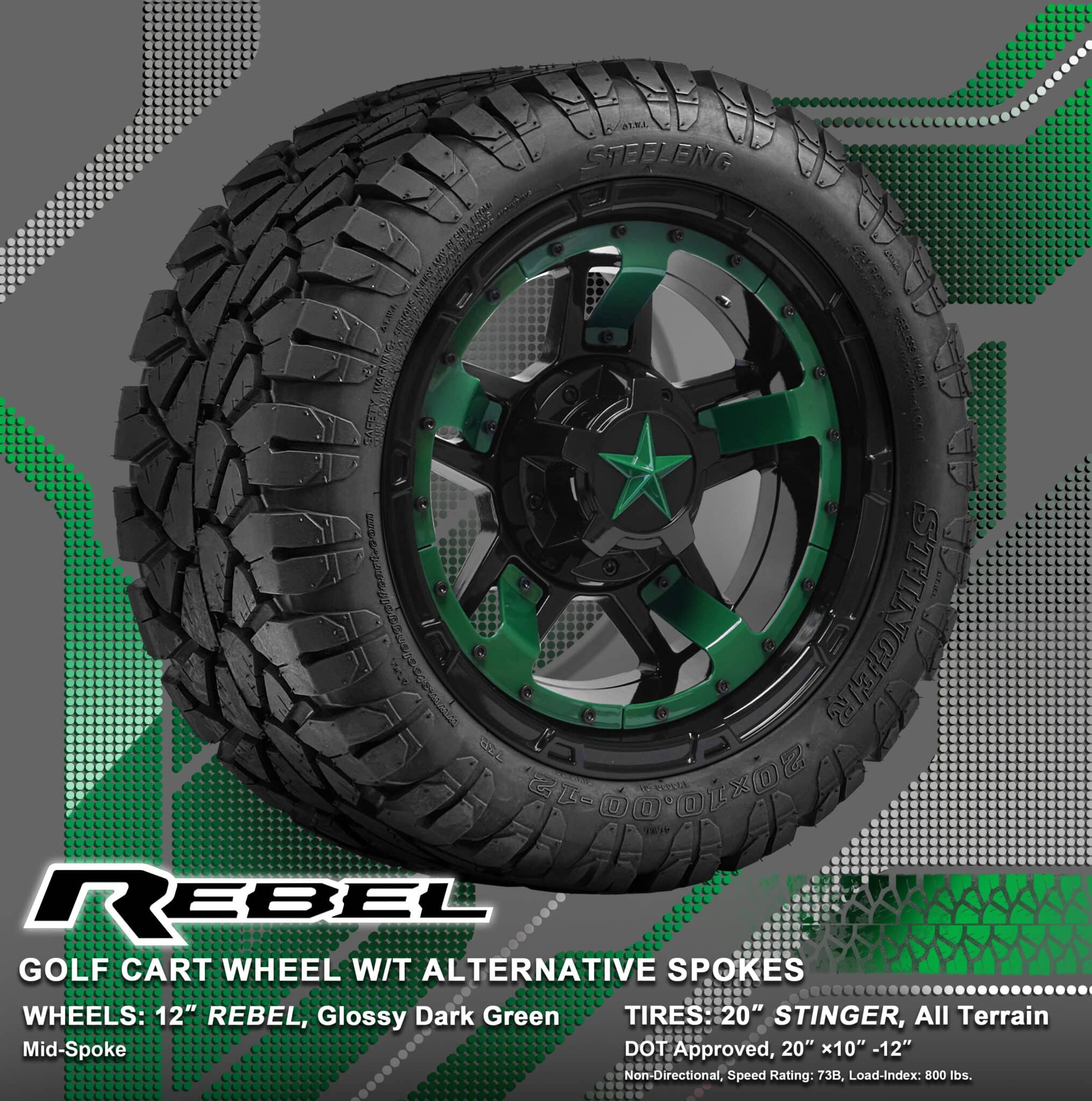 BNDL-TR1204-WH1251-WIRB05-LN0002 – SGC 12″ REBEL Glossy Black Wheel – Aluminum Alloy / STEELENG 20″x10″-12″ STINGER All Terrain Tire DOT approved / REBEL Inserts-Mid Spoke-Glossy Dark Green