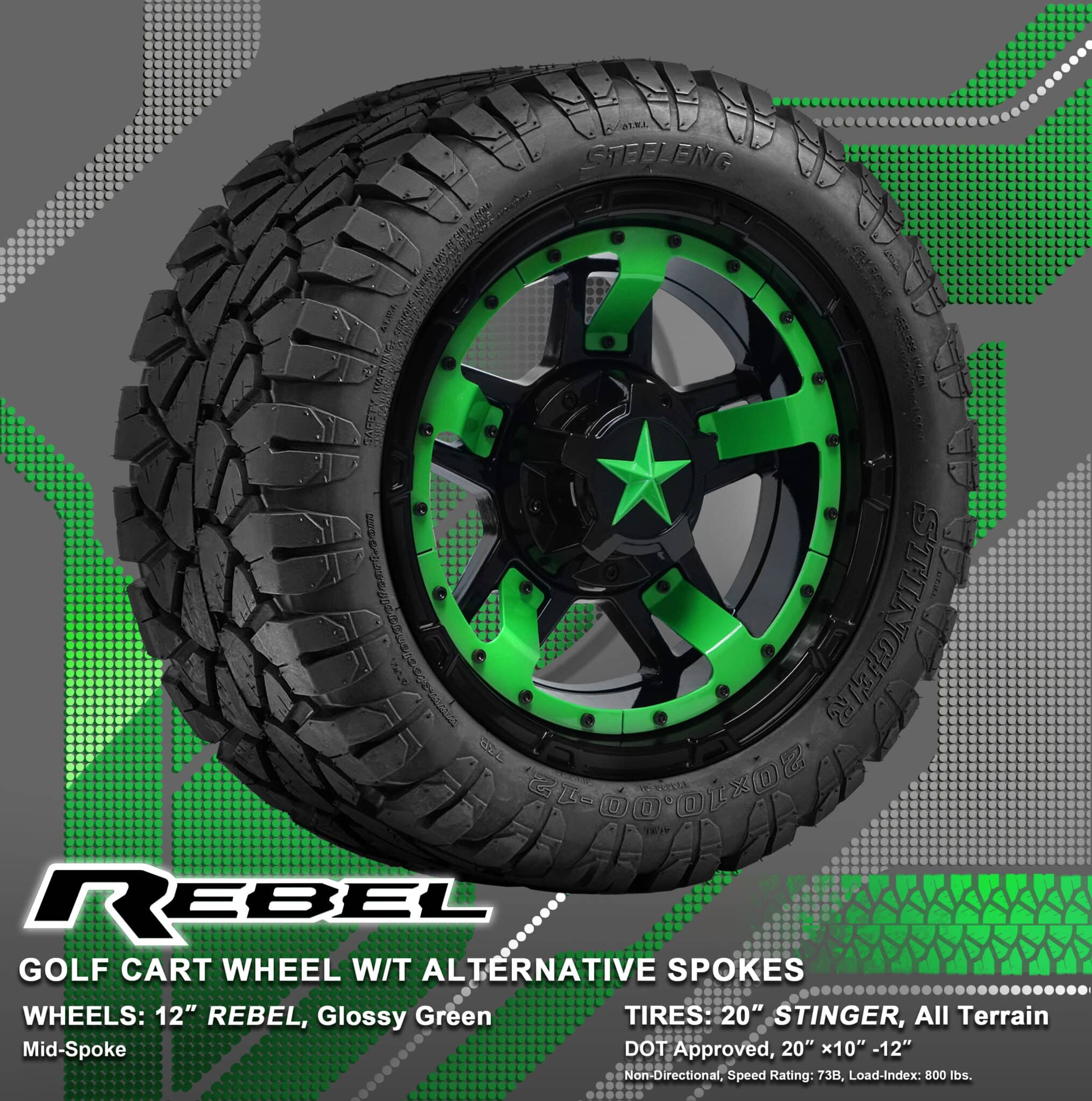 BNDL-TR1204-WH1251-WIRB06-LN0002 – SGC 12″ REBEL Glossy Black Wheel – Aluminum Alloy / STEELENG 20″x10″-12″ STINGER All Terrain Tire DOT approved / REBEL Inserts-Mid Spoke-Glossy Green