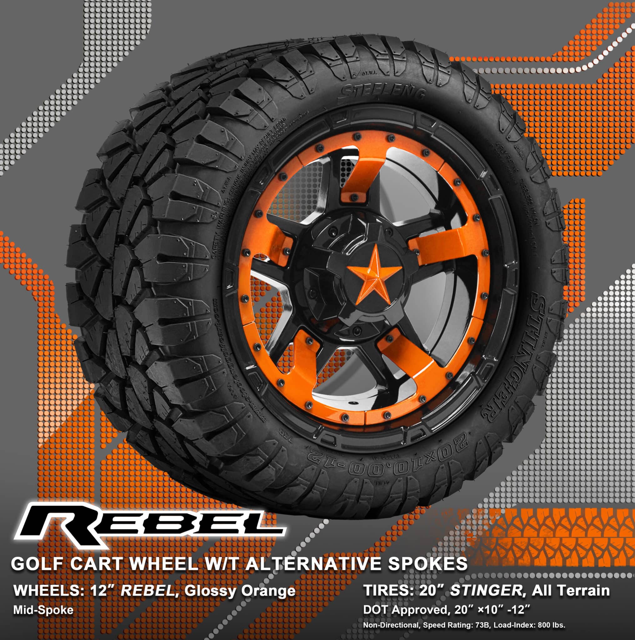 BNDL-TR1204-WH1251-WIRB07-LN0002 – SGC 12″ REBEL Glossy Black Wheel – Aluminum Alloy / STEELENG 20″x10″-12″ STINGER All Terrain Tire DOT approved / REBEL Inserts-Mid Spoke-Glossy Orange