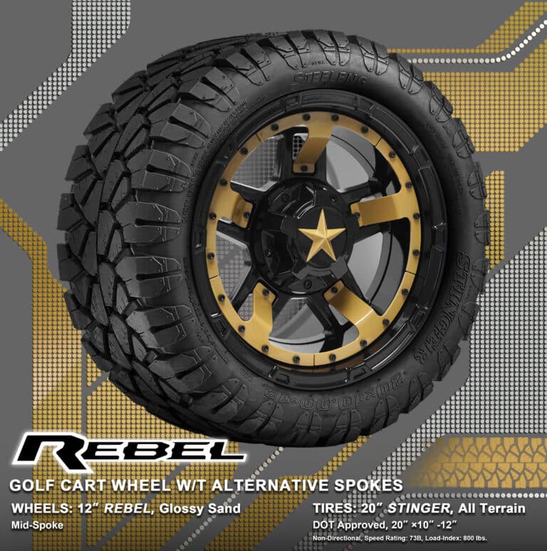 BNDL-TR1204-WH1251-WIRB09-LN0002 – SGC 12″ REBEL Glossy Black Wheel – Aluminum Alloy / STEELENG 20″x10″-12″ STINGER All Terrain Tire DOT approved / REBEL Inserts-Mid Spoke-Glossy Sand