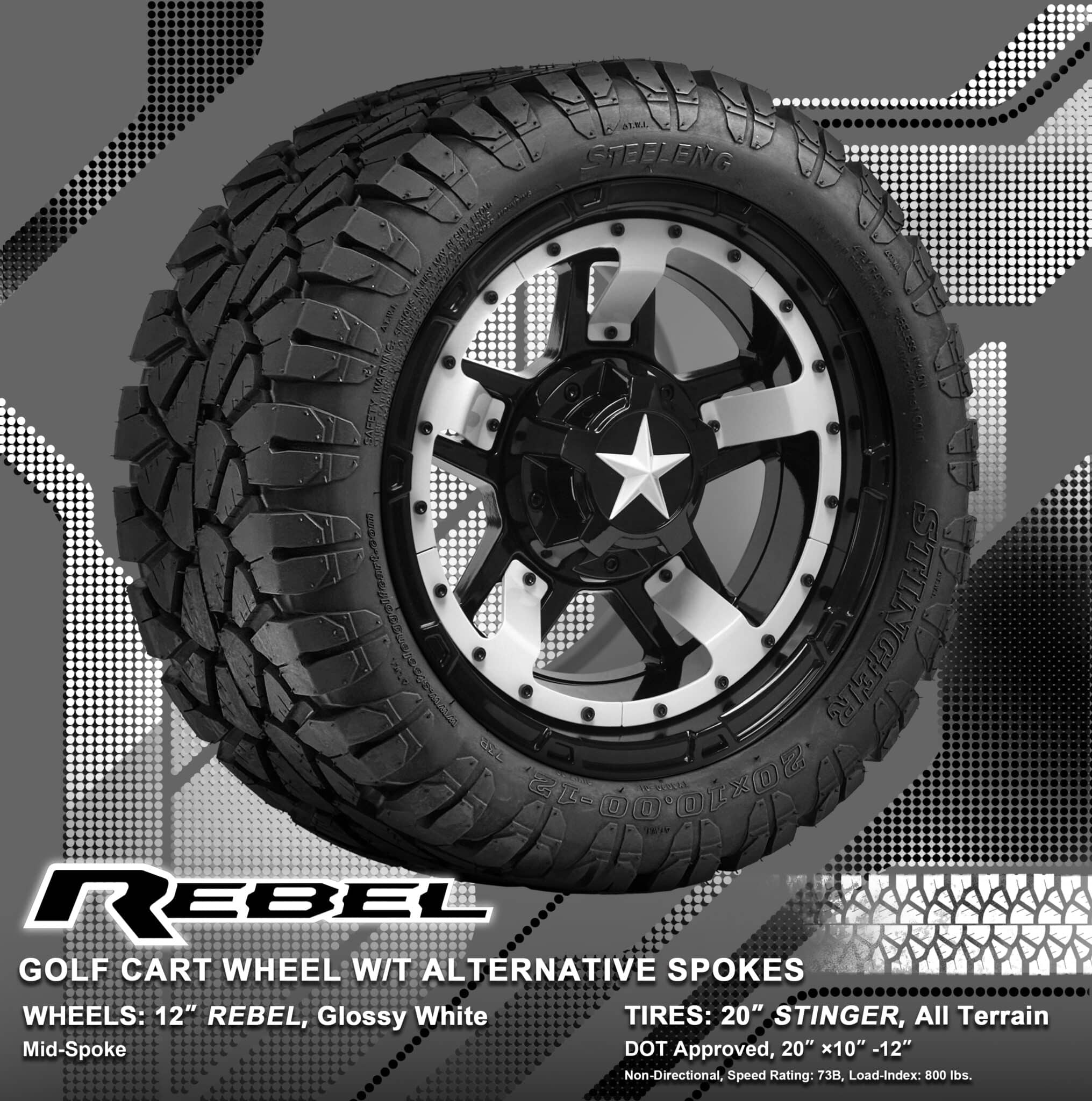 BNDL-TR1204-WH1251-WIRB10-LN0002 – SGC 12″ REBEL Glossy Black Wheel – Aluminum Alloy / STEELENG 20″x10″-12″ STINGER All Terrain Tire DOT approved / REBEL Inserts-Mid Spoke-Glossy White
