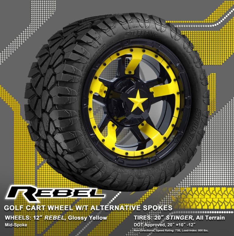 BNDL-TR1204-WH1251-WIRB11-LN0002 – SGC 12″ REBEL Glossy Black Wheel – Aluminum Alloy / STEELENG 20″x10″-12″ STINGER All Terrain Tire DOT approved / REBEL Inserts-Mid Spoke-Glossy Yellow