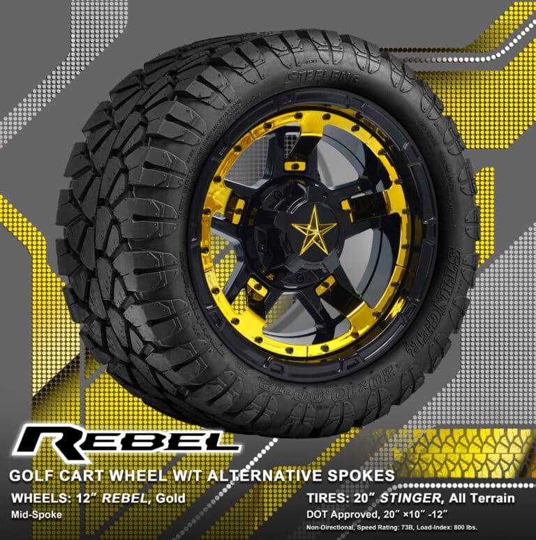 BNDL-TR1204-WH1251-WIRB12-LN0002 – SGC 12″ REBEL Glossy Black Wheel – Aluminum Alloy / STEELENG 20″x10″-12″ STINGER All Terrain Tire DOT approved / REBEL Inserts-Mid Spoke-Gold