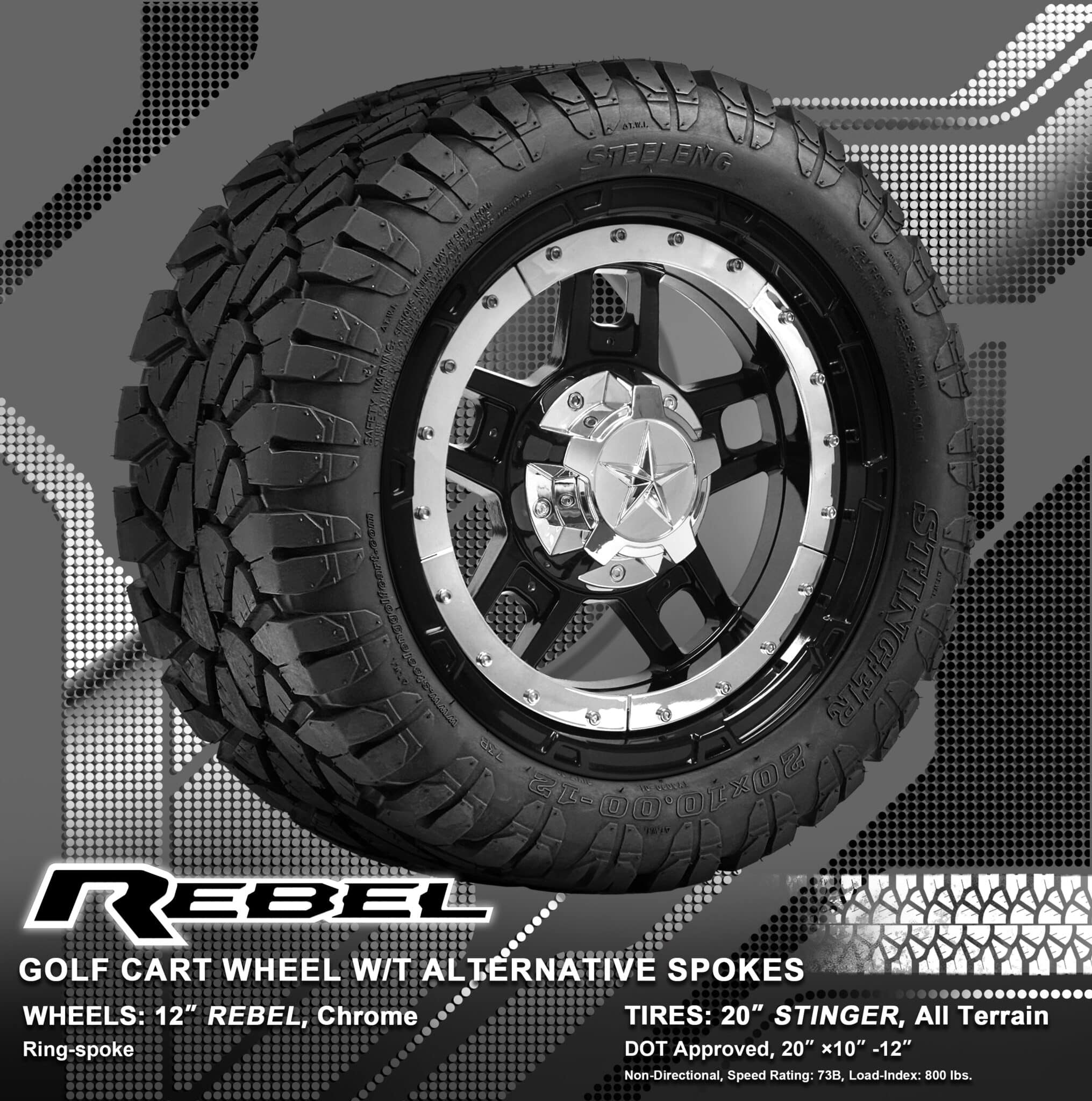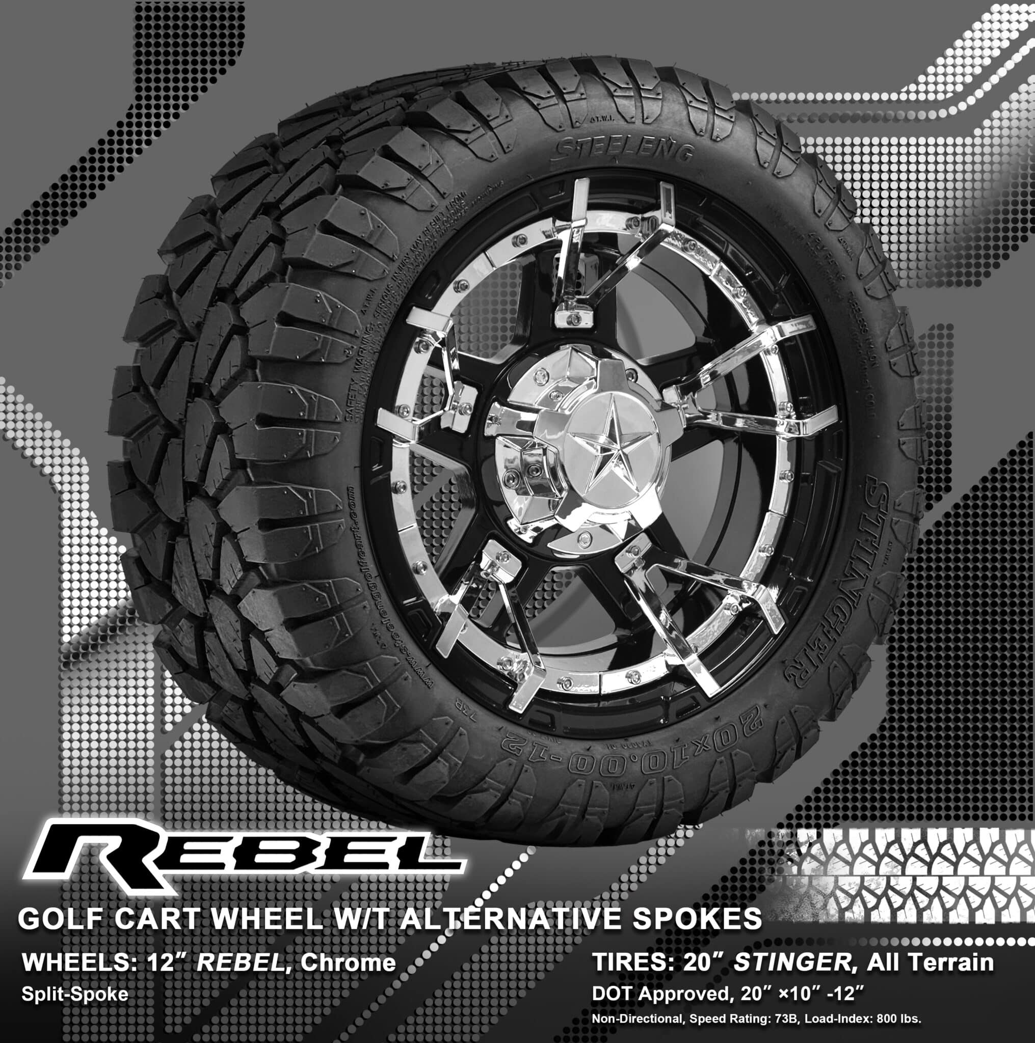 BNDL-TR1204-WH1251-WIRB28-LN0002 – SGC 12″ REBEL Glossy Black Wheel – Aluminum Alloy / STEELENG 20″x10″-12″ STINGER All Terrain Tire DOT approved / REBEL Inserts-Split Spoke-Chrome