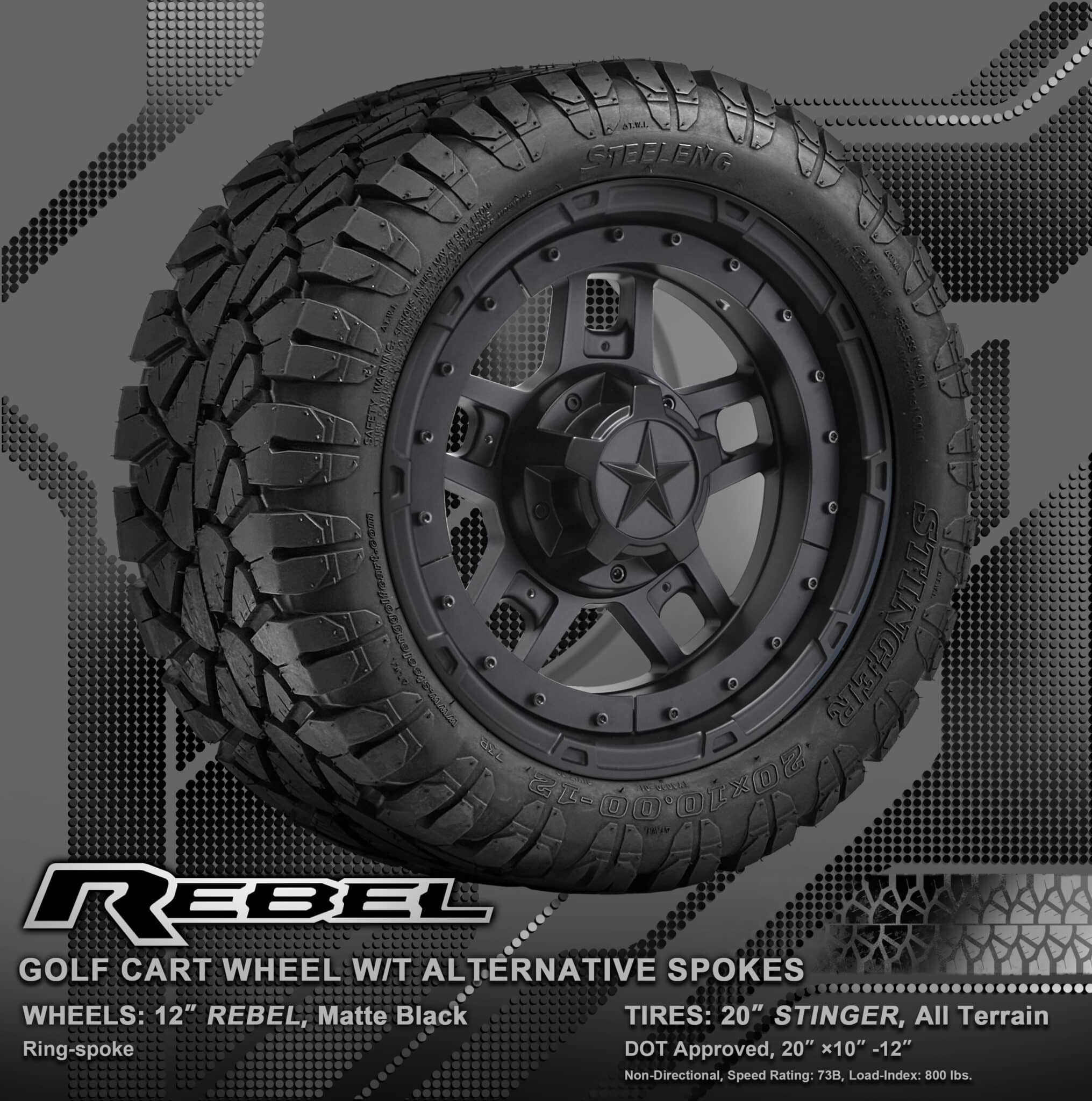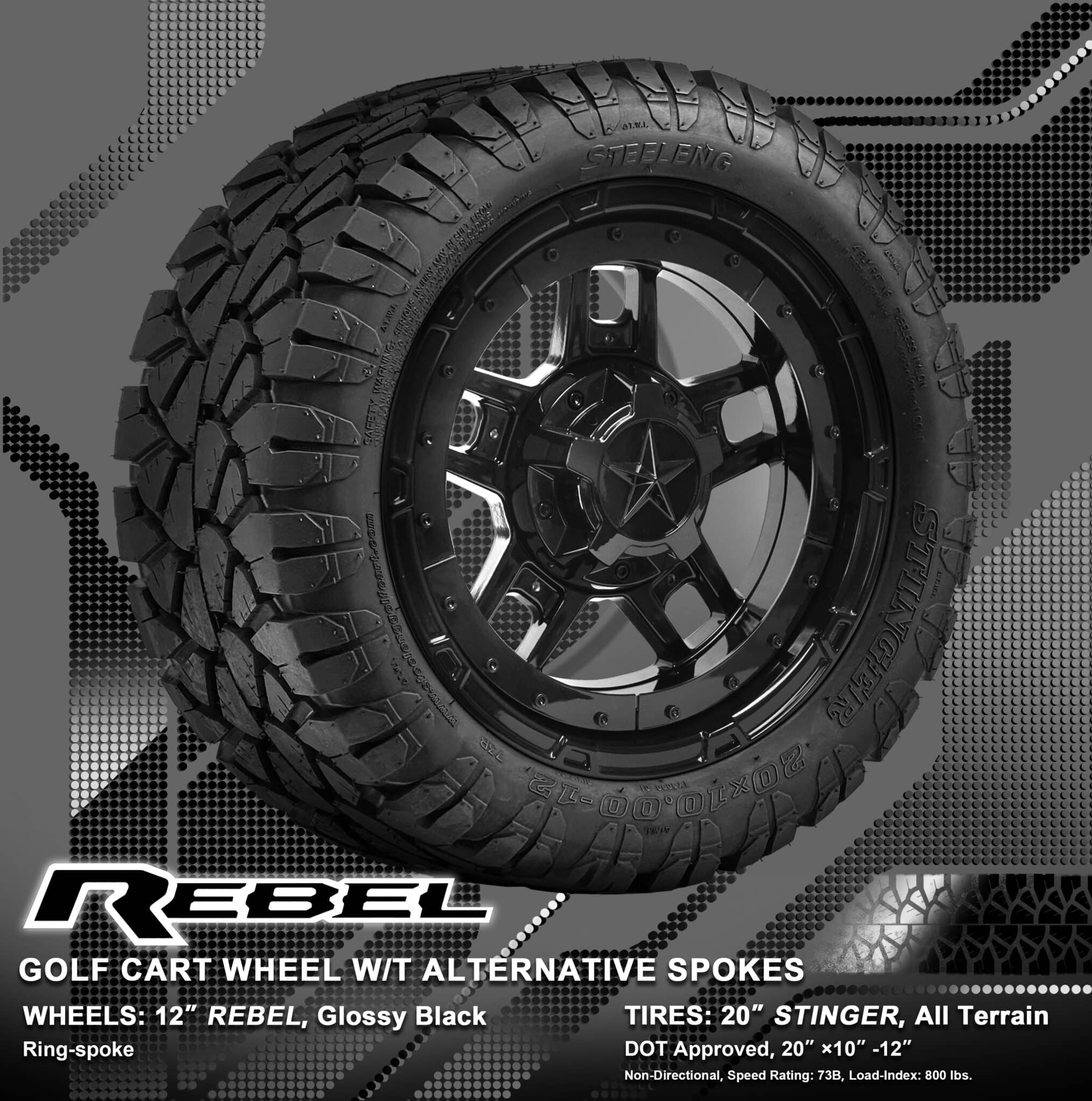 BNDL-TR1204-WH1251-WIRB26-LN0002 – SGC 12″ REBEL Glossy Black Wheel – Aluminum Alloy / STEELENG 20″x10″-12″ STINGER All Terrain Tire DOT approved / REBEL Inserts-Ring-Matte Black