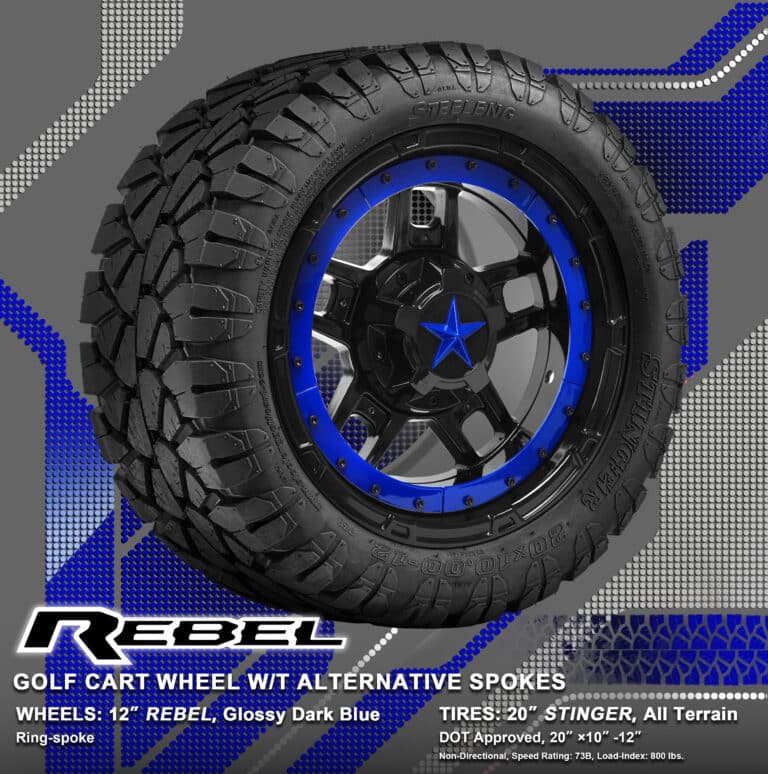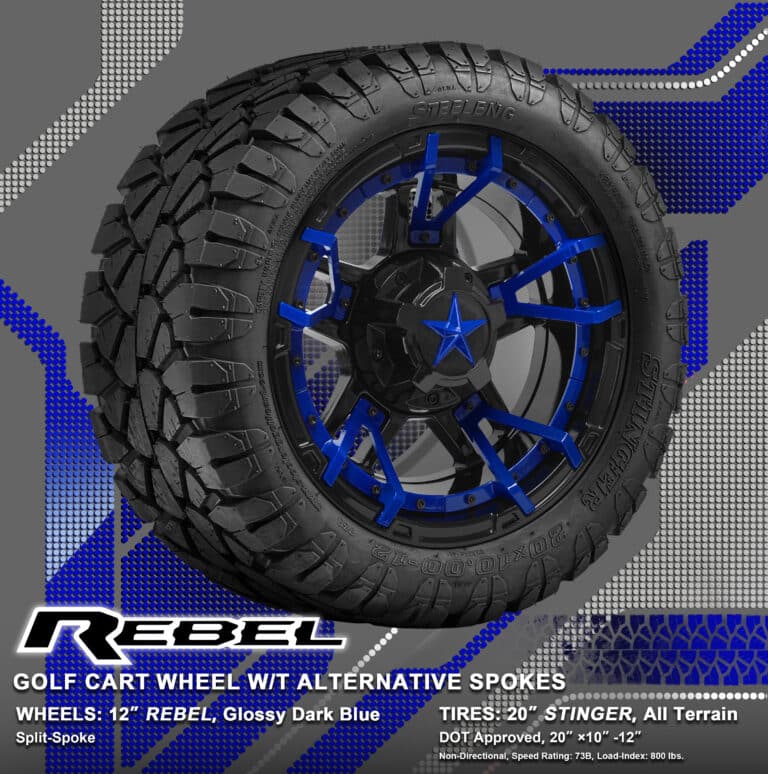 BNDL-TR1204-WH1251-WIRB30-LN0002 – SGC 12″ REBEL Glossy Black Wheel – Aluminum Alloy / STEELENG 20″x10″-12″ STINGER All Terrain Tire DOT approved / REBEL Inserts-Split Spoke-Glossy Dark Blue