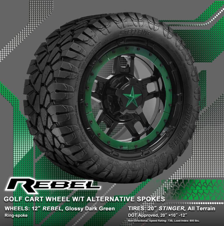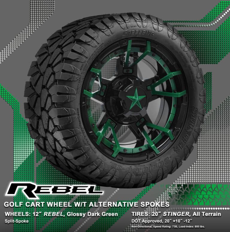 BNDL-TR1204-WH1251-WIRB31-LN0002 – SGC 12″ REBEL Glossy Black Wheel – Aluminum Alloy / STEELENG 20″x10″-12″ STINGER All Terrain Tire DOT approved / REBEL Inserts-Split Spoke-Glossy Dark Green