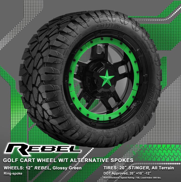 BNDL-TR1204-WH1251-WIRB32-LN0002 – SGC 12″ REBEL Glossy Black Wheel – Aluminum Alloy / STEELENG 20″x10″-12″ STINGER All Terrain Tire DOT approved / REBEL Inserts-Split Spoke-Glossy Green