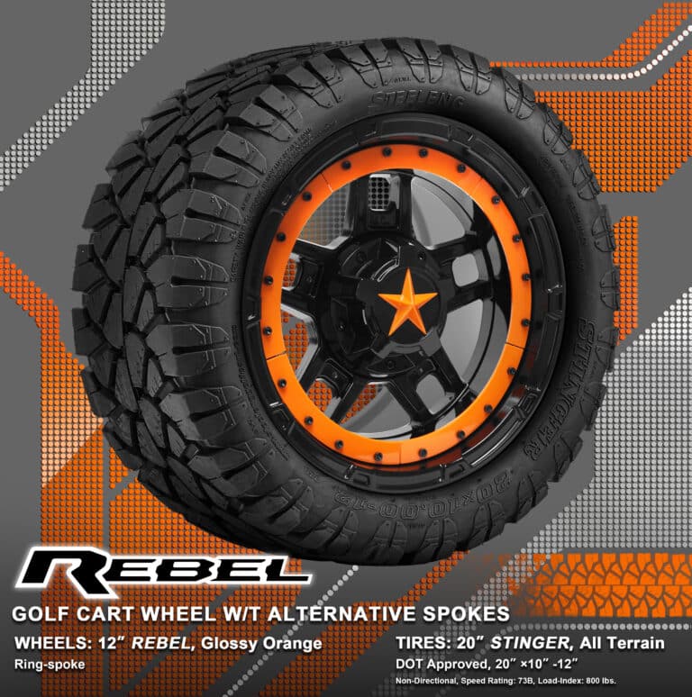 BNDL-TR1204-WH1251-WIRB20-LN0002 – SGC 12″ REBEL Glossy Black Wheel – Aluminum Alloy / STEELENG 20″x10″-12″ STINGER All Terrain Tire DOT approved / REBEL Inserts-Ring-Glossy Orange