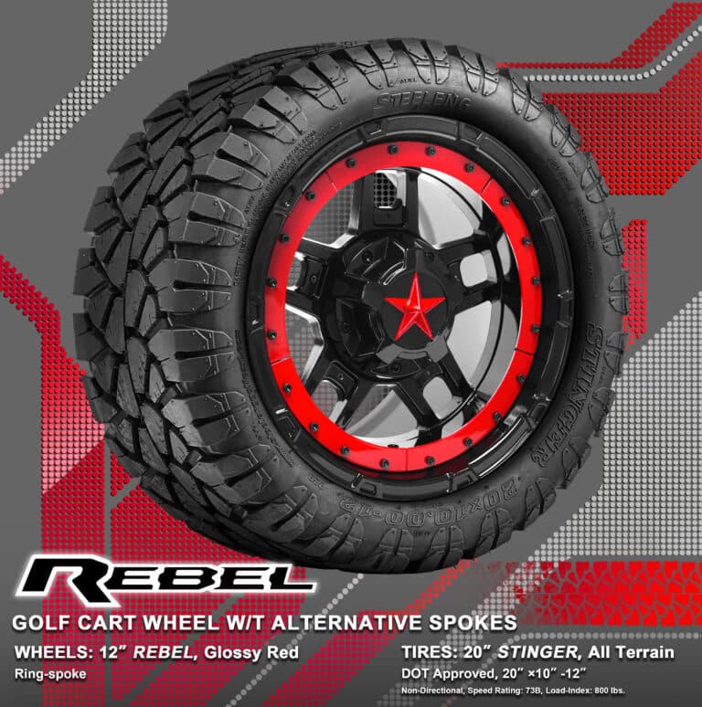 BNDL-TR1204-WH1251-WIRB21-LN0002 – SGC 12″ REBEL Glossy Black Wheel – Aluminum Alloy / STEELENG 20″x10″-12″ STINGER All Terrain Tire DOT approved / REBEL Inserts-Ring-Glossy Red