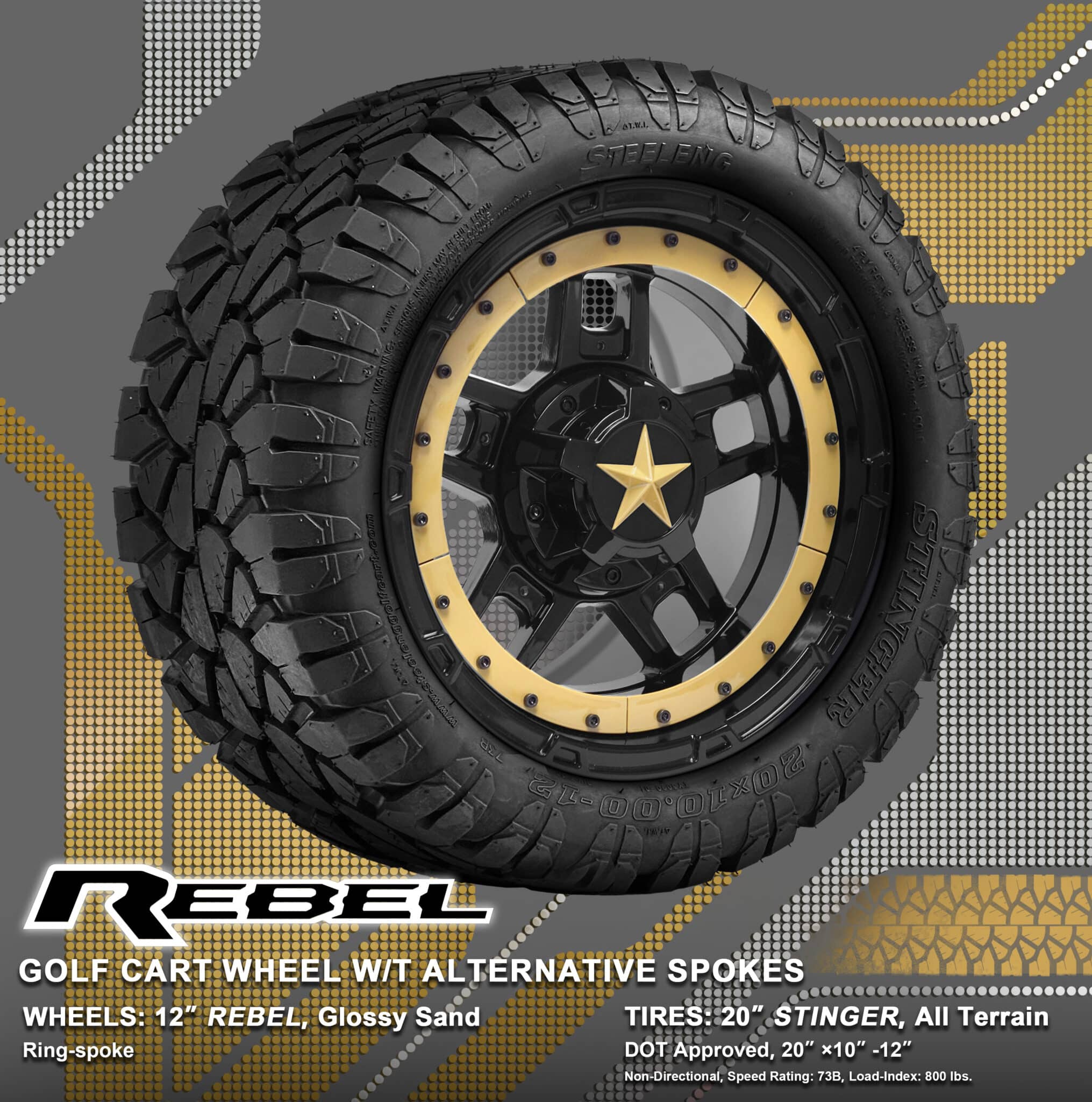 BNDL-TR1204-WH1251-WIRB22-LN0002 – SGC 12″ REBEL Glossy Black Wheel – Aluminum Alloy / STEELENG 20″x10″-12″ STINGER All Terrain Tire DOT approved / REBEL Inserts-Ring-Glossy Sand