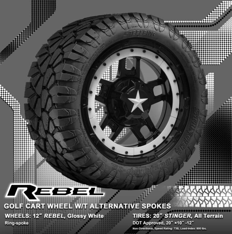 BNDL-TR1204-WH1251-WIRB23-LN0002 – SGC 12″ REBEL Glossy Black Wheel – Aluminum Alloy / STEELENG 20″x10″-12″ STINGER All Terrain Tire DOT approved / REBEL Inserts-Ring-Glossy White