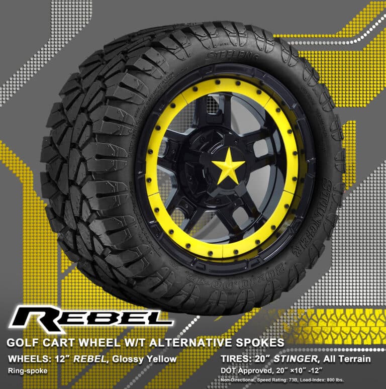 BNDL-TR1204-WH1251-WIRB24-LN0002 – SGC 12″ REBEL Glossy Black Wheel – Aluminum Alloy / STEELENG 20″x10″-12″ STINGER All Terrain Tire DOT approved / REBEL Inserts-Ring-Glossy Yellow
