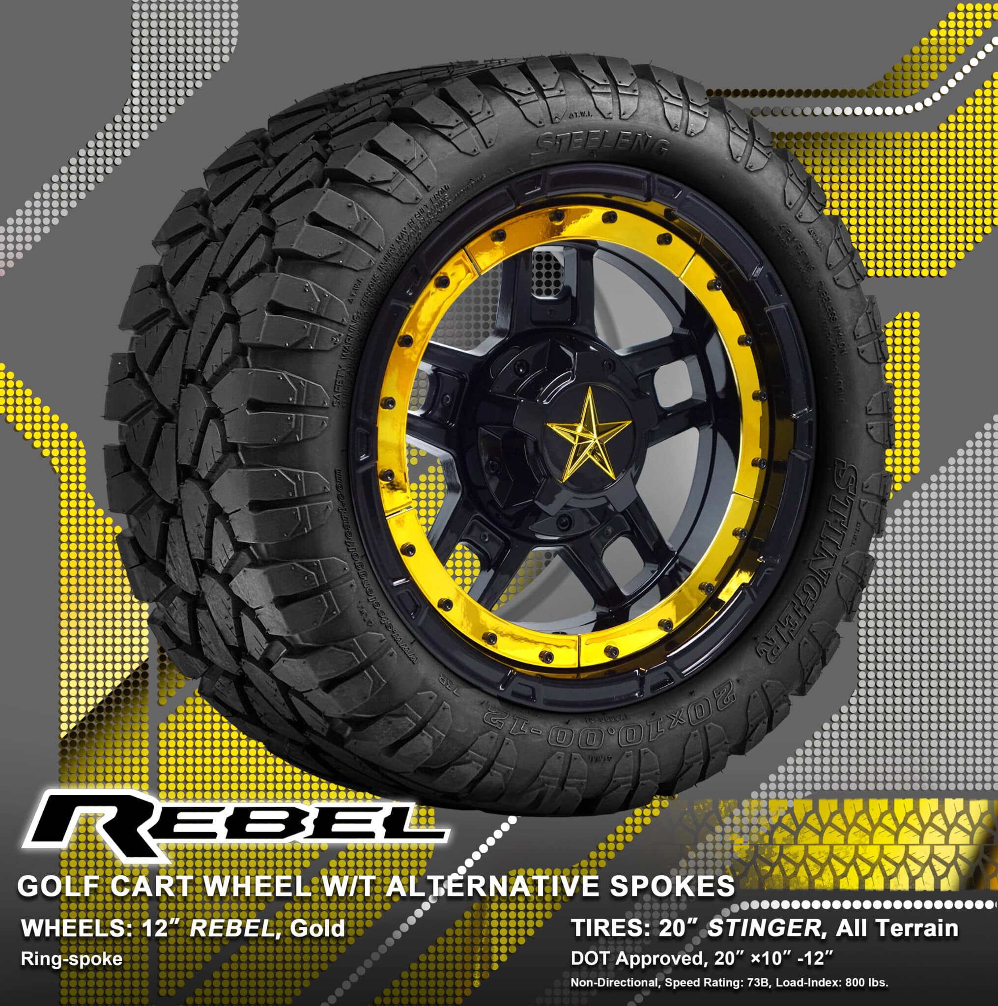 BNDL-TR1204-WH1251-WIRB25-LN0002 – SGC 12″ REBEL Glossy Black Wheel – Aluminum Alloy / STEELENG 20″x10″-12″ STINGER All Terrain Tire DOT approved / REBEL Inserts-Ring-Gold