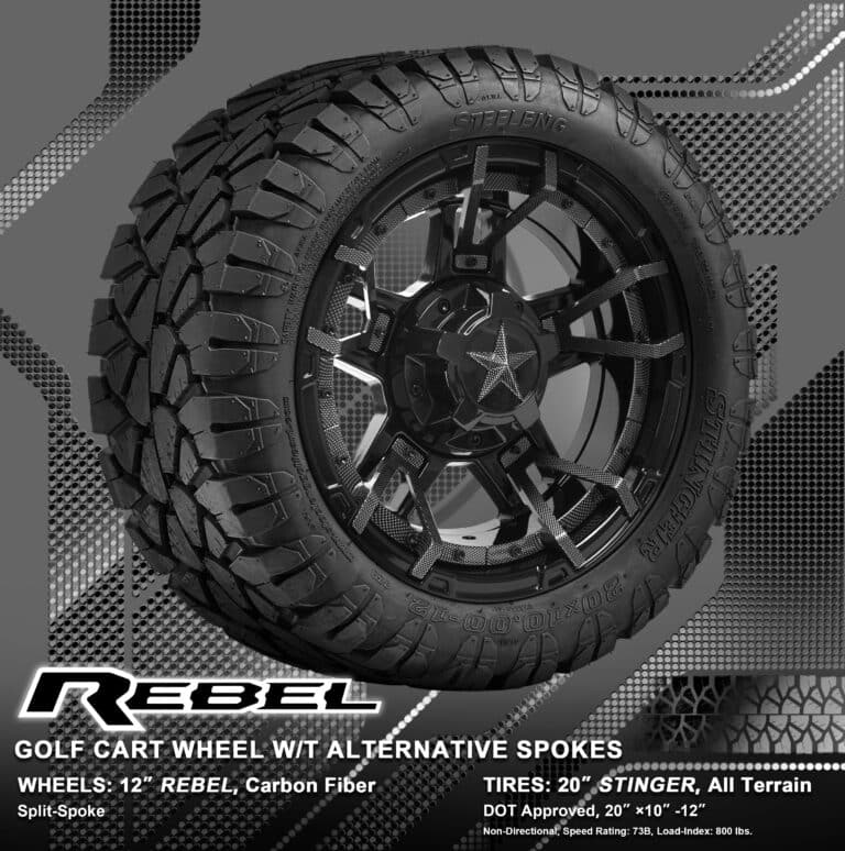 BNDL-TR1204-WH1251-WIRB27-LN0002 – SGC 12″ REBEL Glossy Black Wheel – Aluminum Alloy / STEELENG 20″x10″-12″ STINGER All Terrain Tire DOT approved / REBEL Inserts-Split Spoke-Carbon Fiber