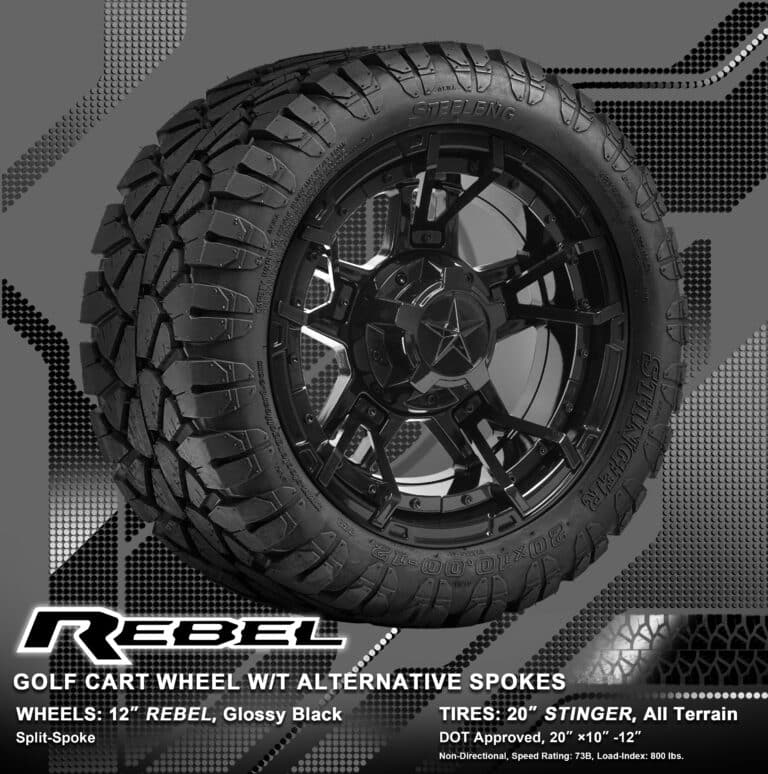 BNDL-TR1204-WH1251-WIRB29-LN0002 – SGC 12″ REBEL Glossy Black Wheel – Aluminum Alloy / STEELENG 20″x10″-12″ STINGER All Terrain Tire DOT approved / REBEL Inserts-Split Spoke-Glossy Black
