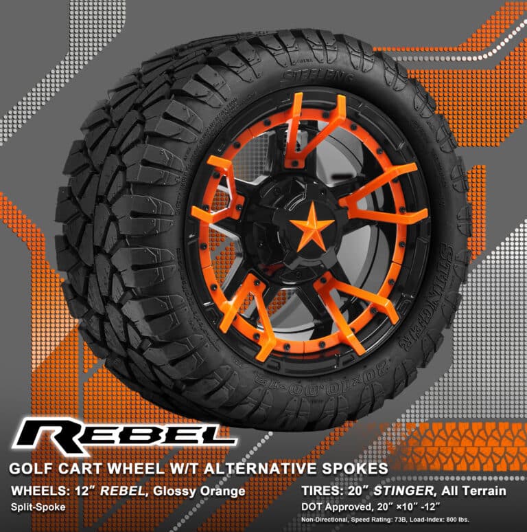 BNDL-TR1204-WH1251-WIRB33-LN0002 – SGC 12″ REBEL Glossy Black Wheel – Aluminum Alloy / STEELENG 20″x10″-12″ STINGER All Terrain Tire DOT approved / REBEL Inserts-Split Spoke-Glossy Orange
