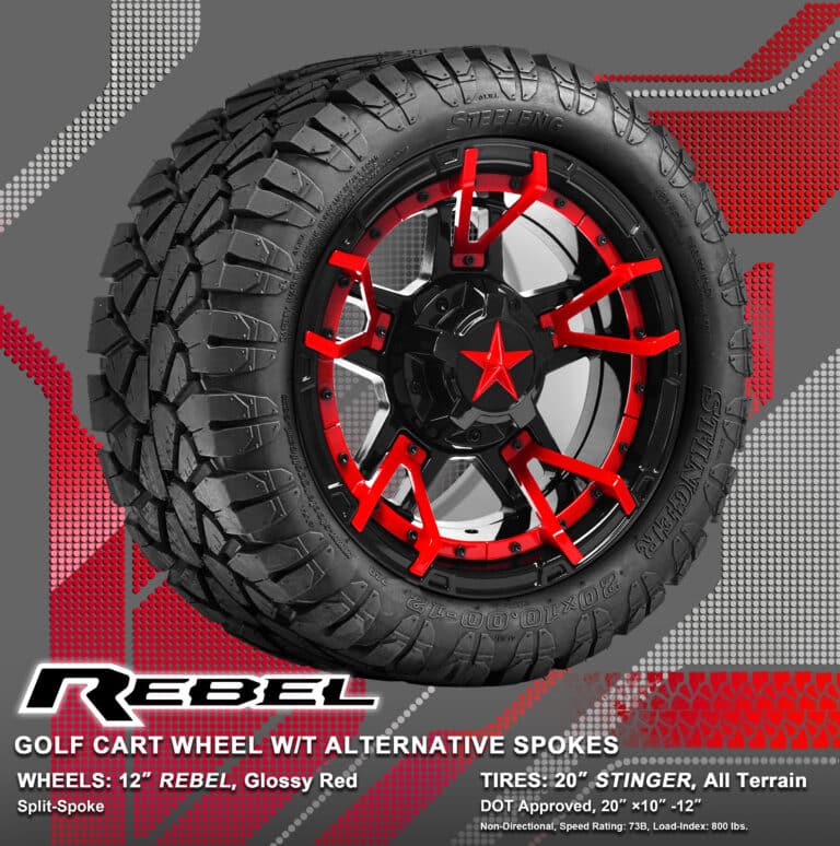 BNDL-TR1204-WH1251-WIRB34-LN0002 – SGC 12″ REBEL Glossy Black Wheel – Aluminum Alloy / STEELENG 20″x10″-12″ STINGER All Terrain Tire DOT approved / REBEL Inserts-Split Spoke-Glossy Red