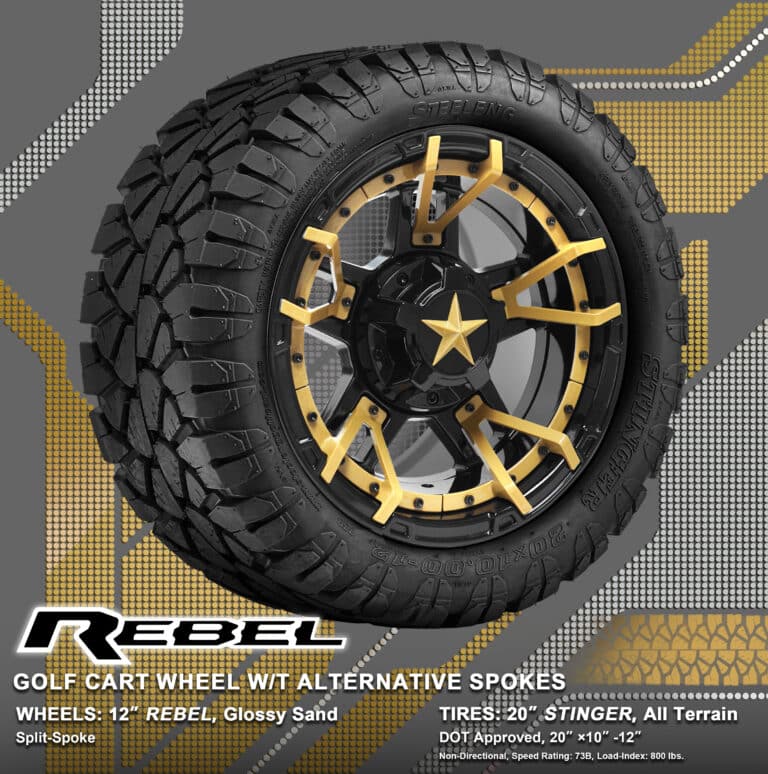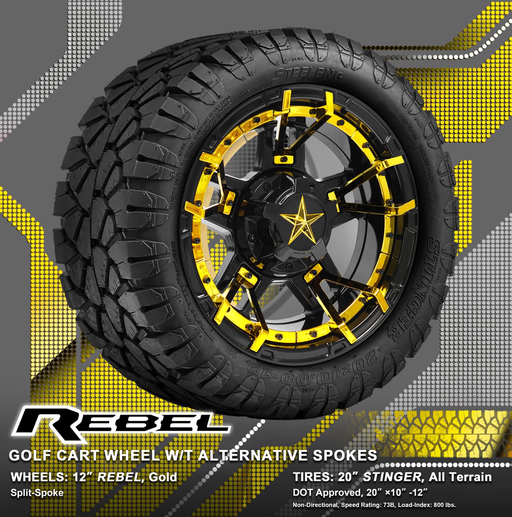 BNDL-TR1204-WH1251-WIRB38-LN0002 – SGC 12″ REBEL Glossy Black Wheel – Aluminum Alloy / STEELENG 20″x10″-12″ STINGER All Terrain Tire DOT approved / REBEL Inserts-Split Spoke-Gold