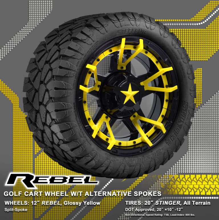 BNDL-TR1204-WH1251-WIRB37-LN0002 – SGC 12″ REBEL Glossy Black Wheel – Aluminum Alloy / STEELENG 20″x10″-12″ STINGER All Terrain Tire DOT approved / REBEL Inserts-Split Spoke-Glossy Yellow