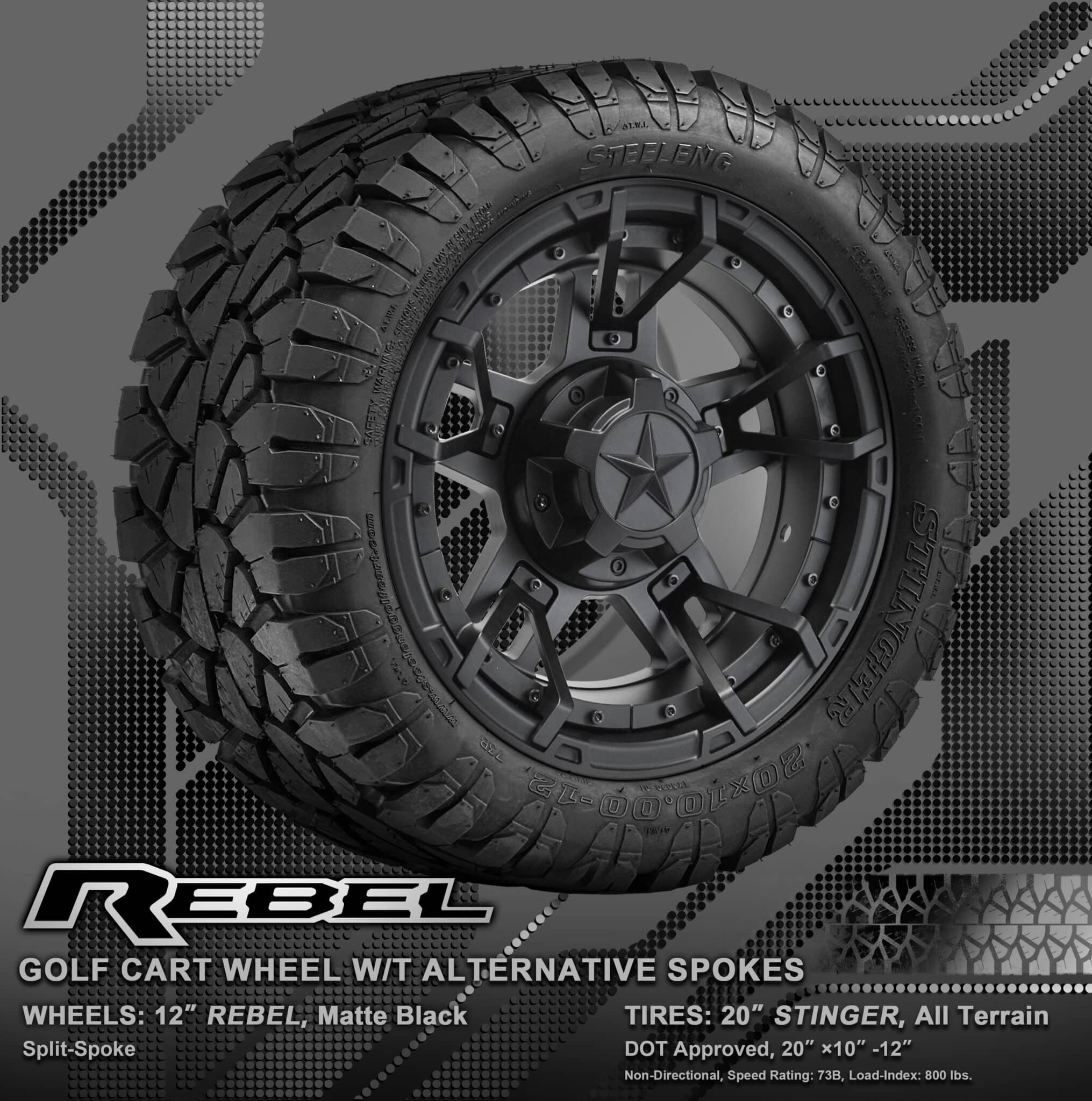 BNDL-TR1204-WH1251-WIRB39-LN0002 – SGC 12″ REBEL Glossy Black Wheel – Aluminum Alloy / STEELENG 20″x10″-12″ STINGER All Terrain Tire DOT approved / REBEL Inserts-Split Spoke-Matte Black