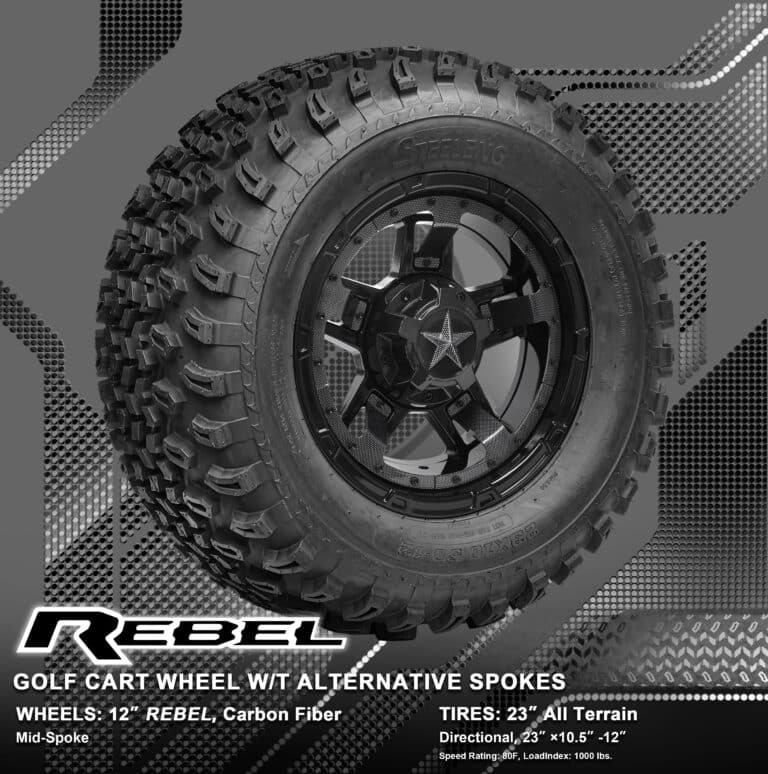 BNDL-TR1205-WH1251-WIRB01-LN0002 – SGC 12″ REBEL Glossy Black Wheel – Aluminum Alloy / STEELENG 23″x10.5″-12″ All Terrain Tire / REBEL Inserts-Mid Spoke-Carbon Fiber