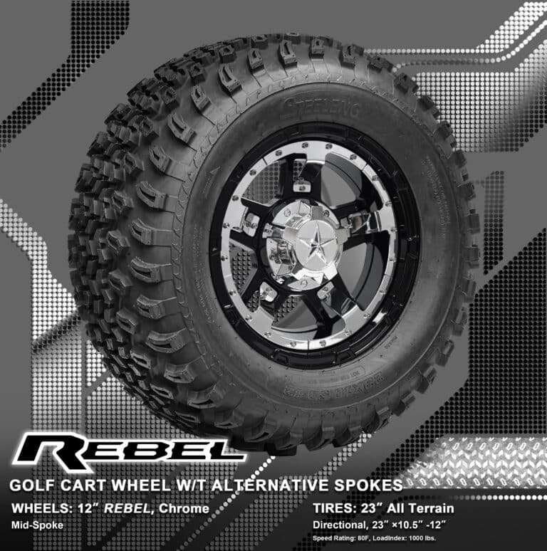 BNDL-TR1205-WH1251-WIRB02-LN0002 – SGC 12″ REBEL Glossy Black Wheel – Aluminum Alloy / STEELENG 23″x10.5″-12″ All Terrain Tire / REBEL Inserts-Mid Spoke-Chrome