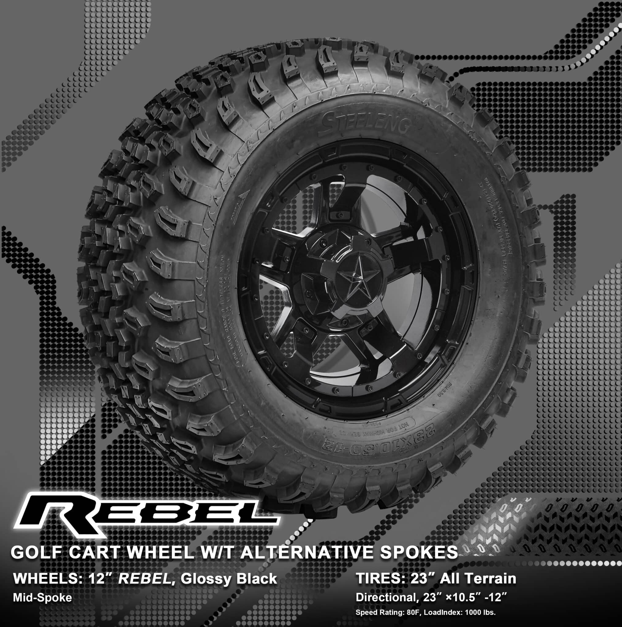 BNDL-TR1205-WH1251-WIRB03-LN0002 – SGC 12″ REBEL Glossy Black Wheel – Aluminum Alloy / STEELENG 23″x10.5″-12″ All Terrain Tire / REBEL Inserts-Mid Spoke-Glossy Black
