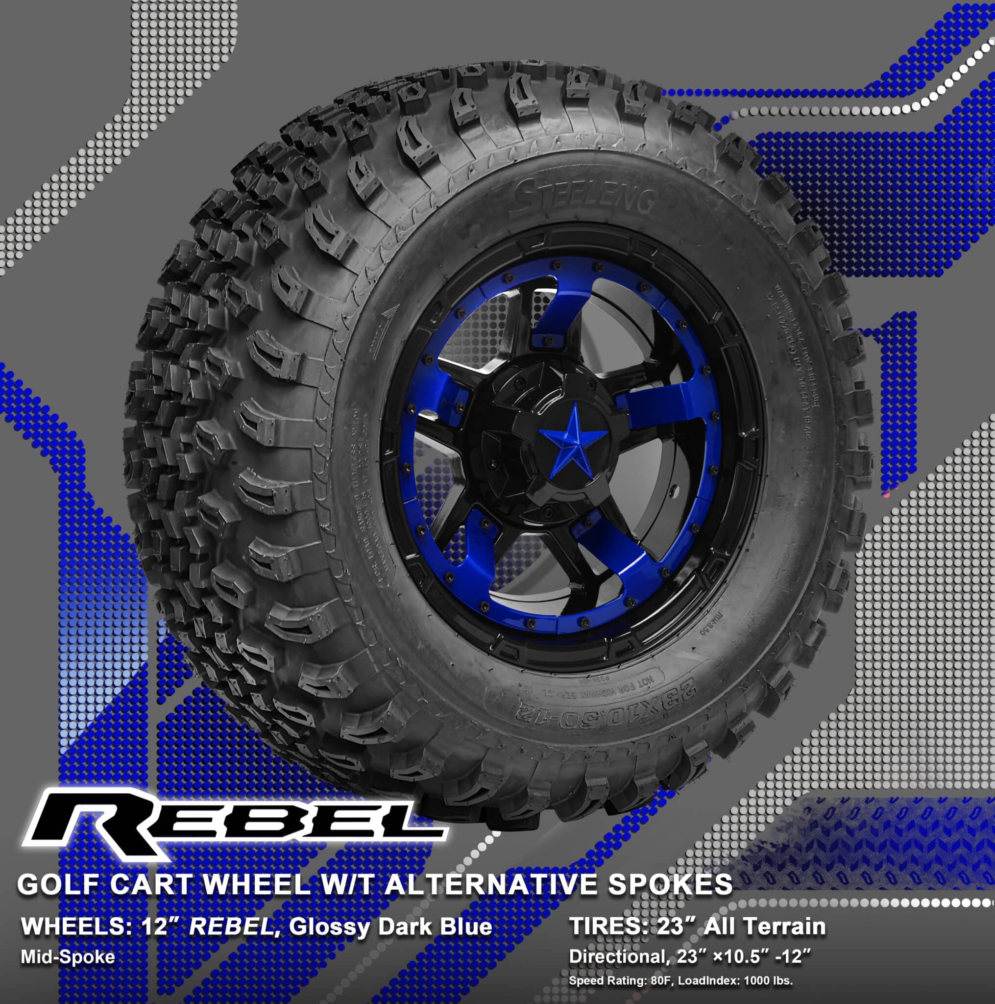 BNDL-TR1205-WH1251-WIRB04-LN0002 – SGC 12″ REBEL Glossy Black Wheel – Aluminum Alloy / STEELENG 23″x10.5″-12″ All Terrain Tire / REBEL Inserts-Mid Spoke-Glossy Dark Blue