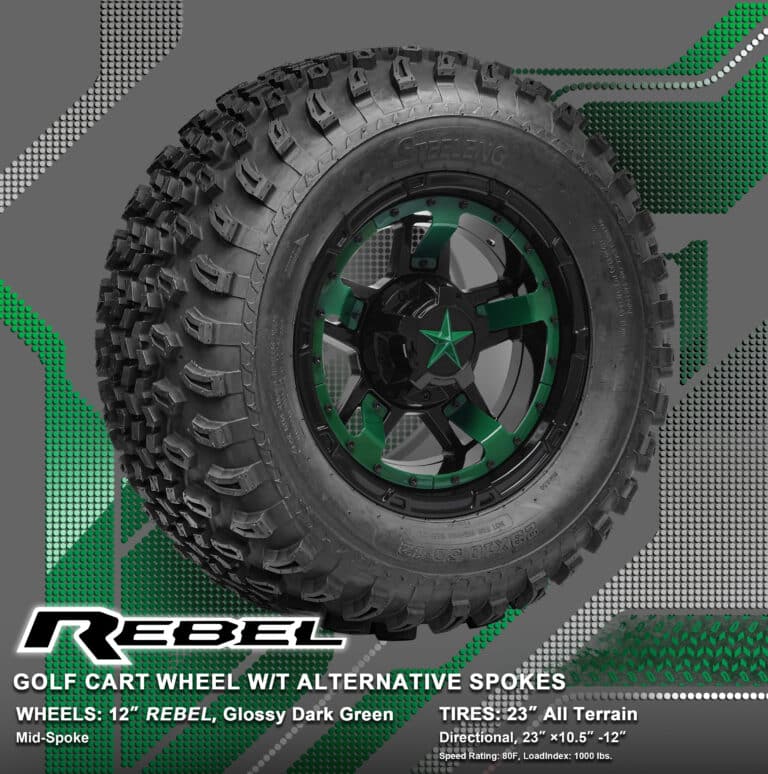 BNDL-TR1205-WH1251-WIRB05-LN0002 – SGC 12″ REBEL Glossy Black Wheel – Aluminum Alloy / STEELENG 23″x10.5″-12″ All Terrain Tire / REBEL Inserts-Mid Spoke-Glossy Dark Green