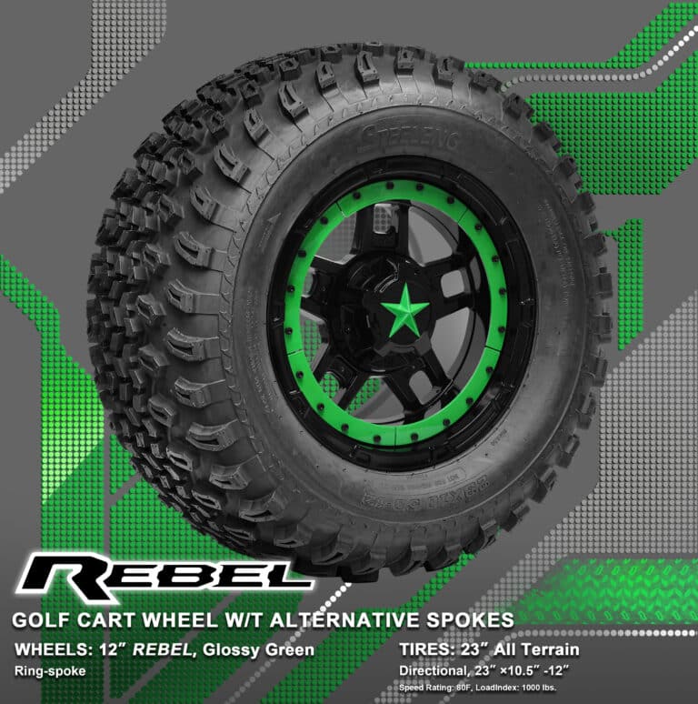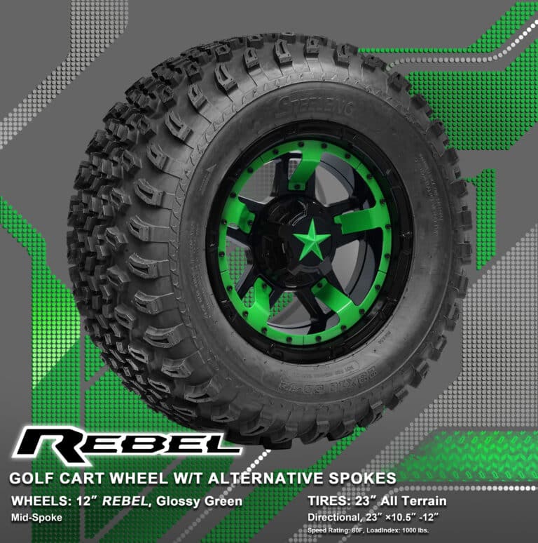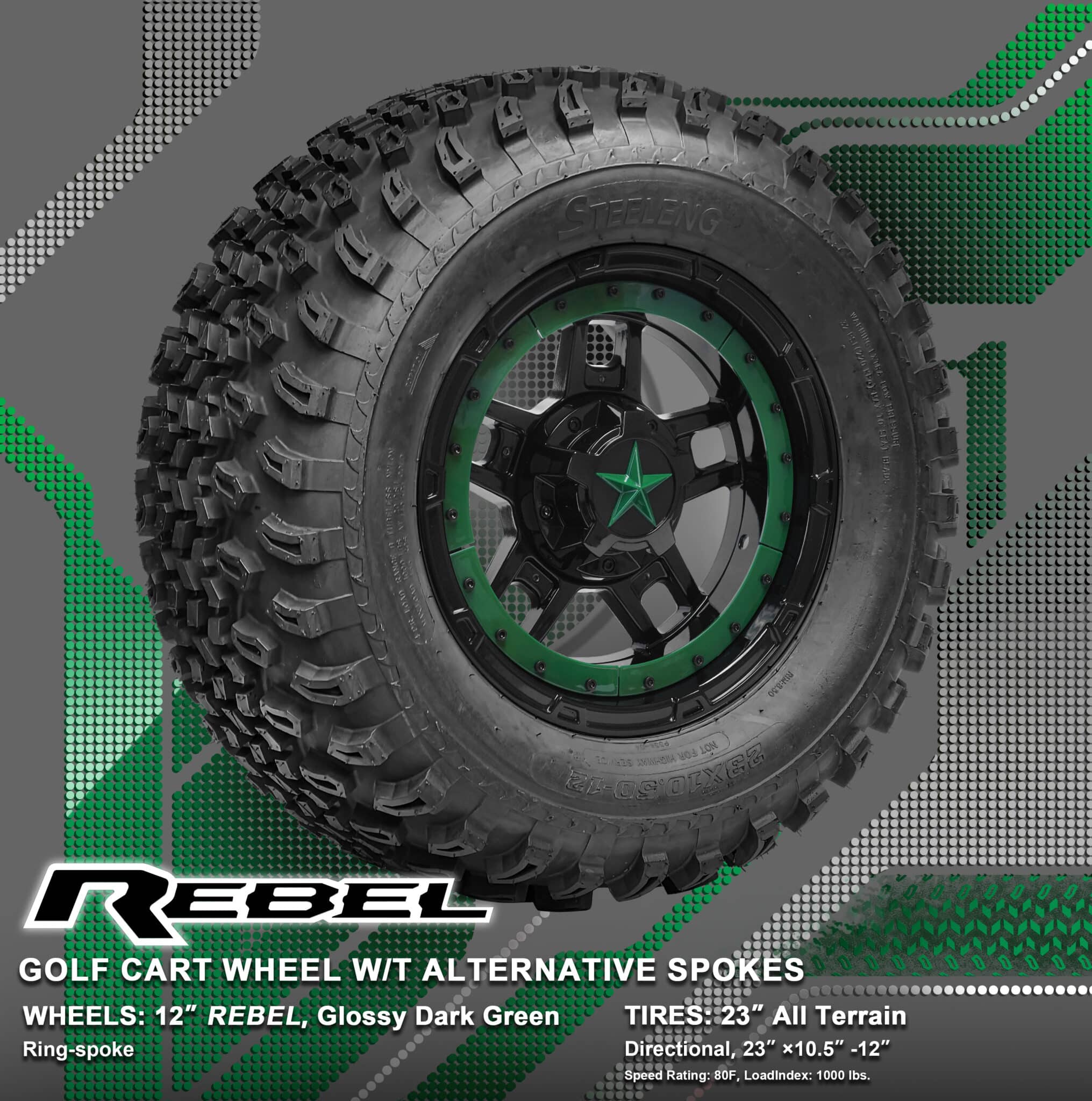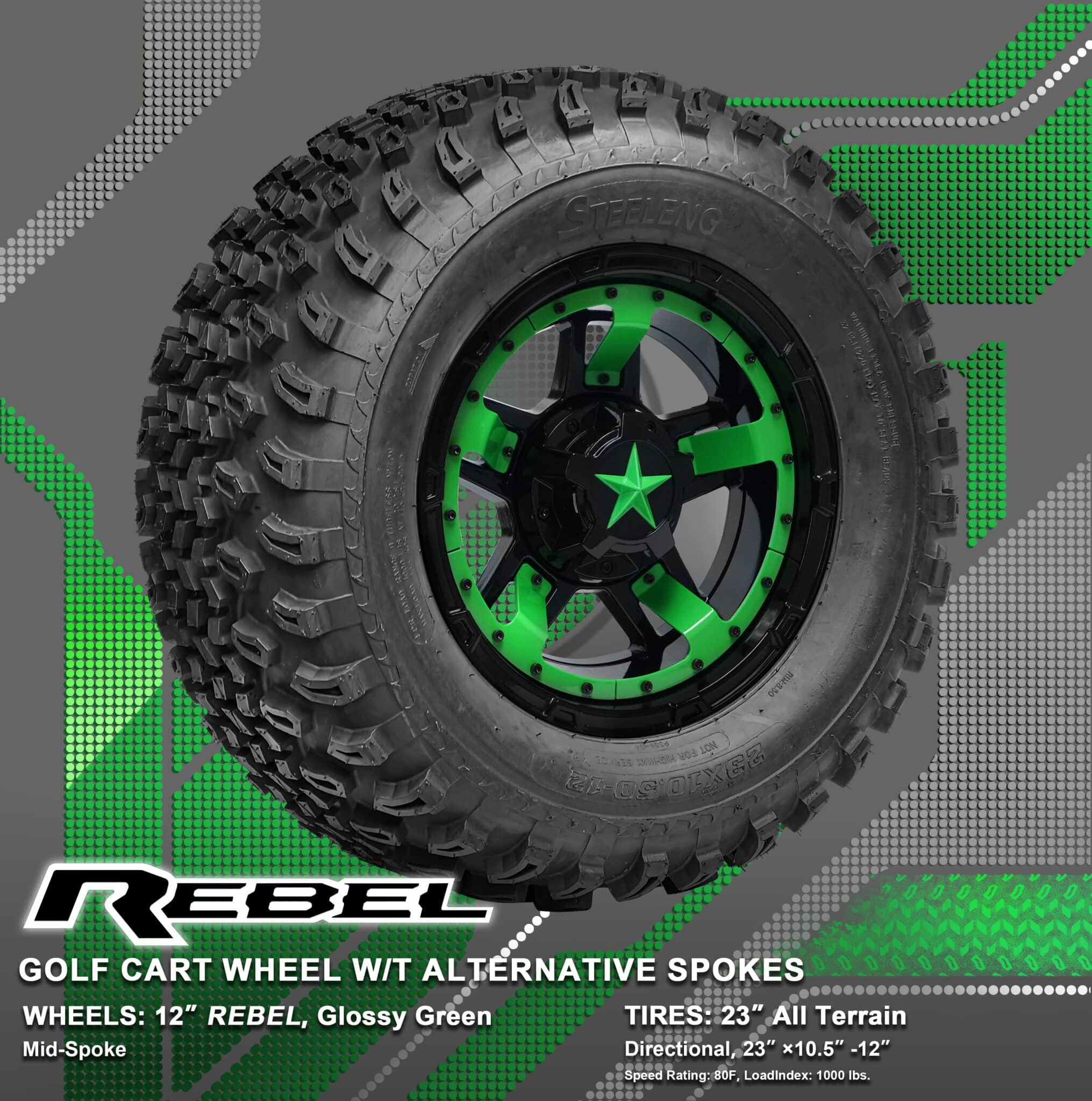 BNDL-TR1205-WH1251-WIRB06-LN0002 – SGC 12″ REBEL Glossy Black Wheel – Aluminum Alloy / STEELENG 23″x10.5″-12″ All Terrain Tire / REBEL Inserts-Mid Spoke-Glossy Green