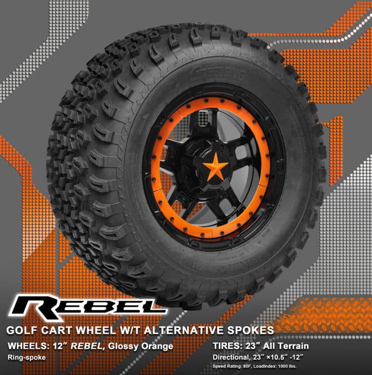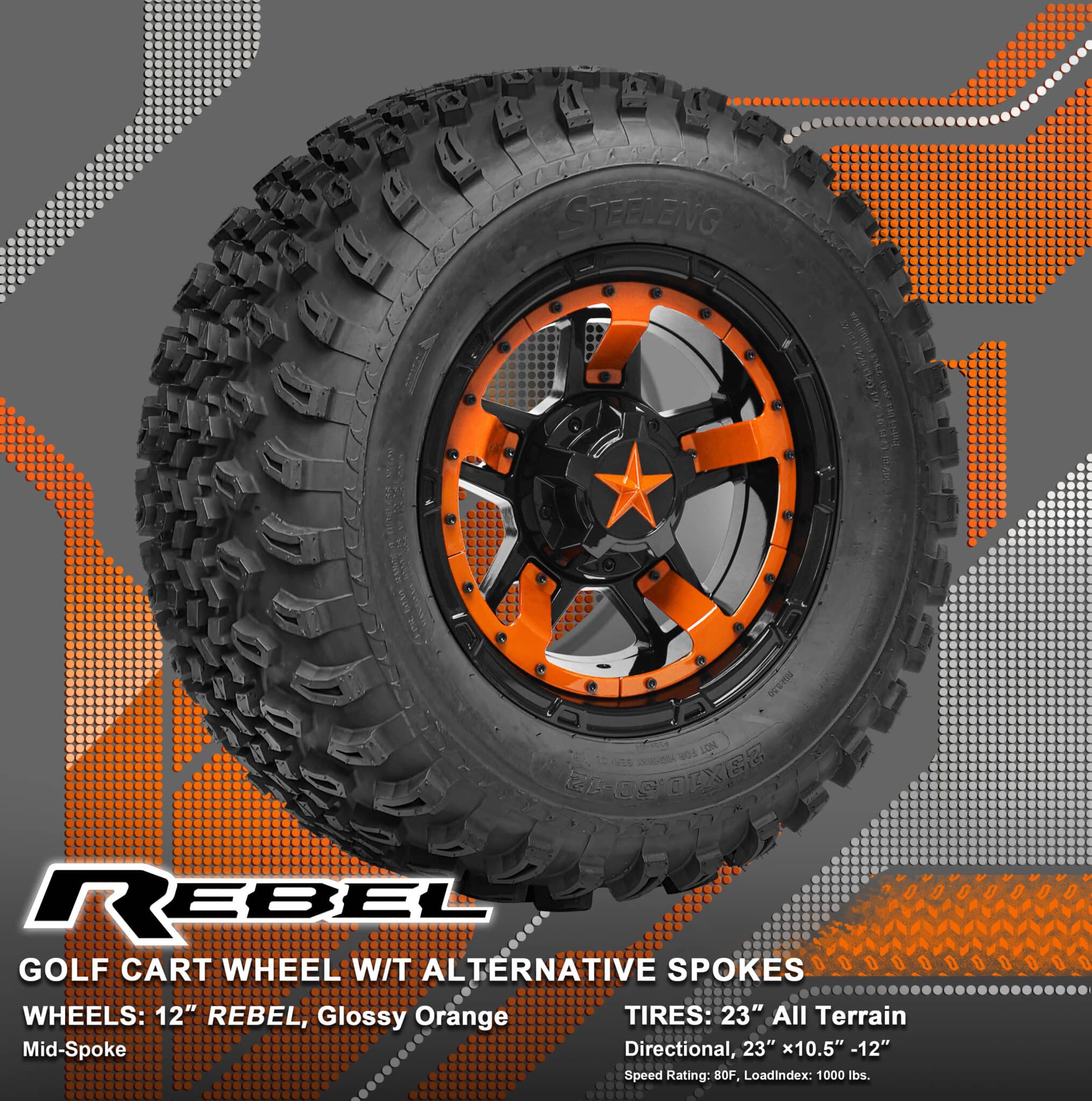 BNDL-TR1205-WH1251-WIRB07-LN0002 – SGC 12″ REBEL Glossy Black Wheel – Aluminum Alloy / STEELENG 23″x10.5″-12″ All Terrain Tire / REBEL Inserts-Mid Spoke-Glossy Orange