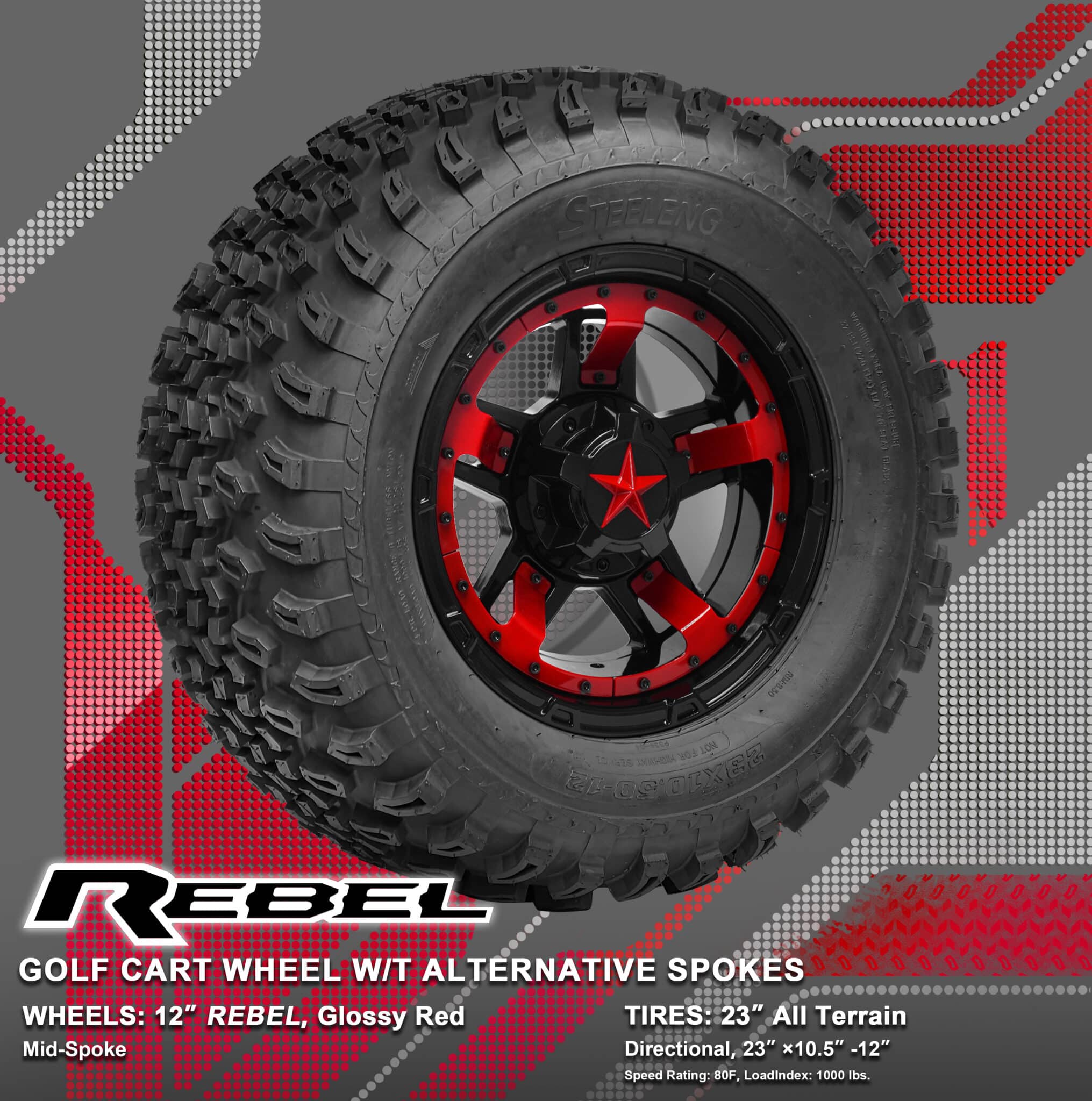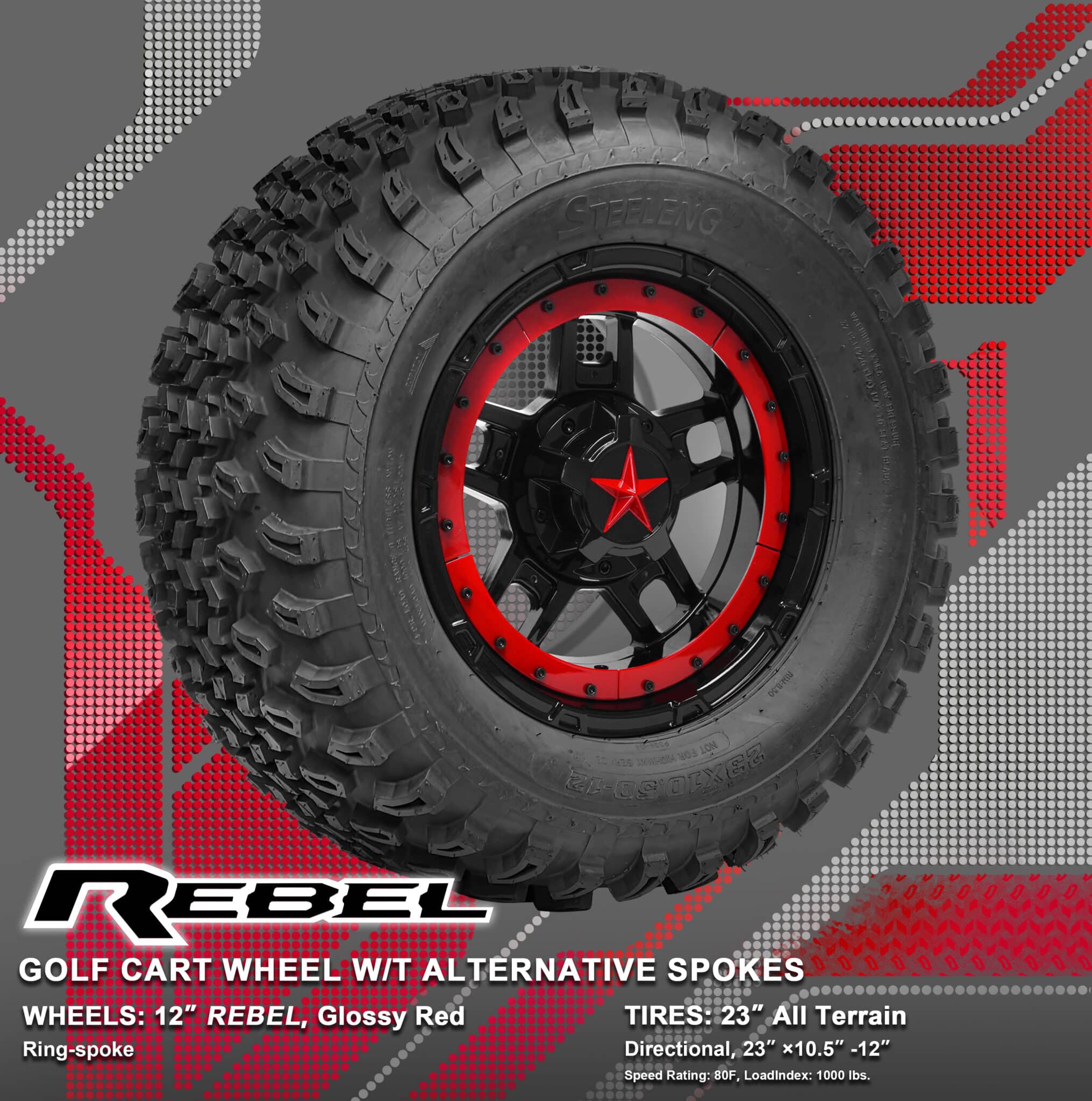 BNDL-TR1205-WH1251-WIRB08-LN0002 – SGC 12″ REBEL Glossy Black Wheel – Aluminum Alloy / STEELENG 23″x10.5″-12″ All Terrain Tire / REBEL Inserts-Mid Spoke-Glossy Red