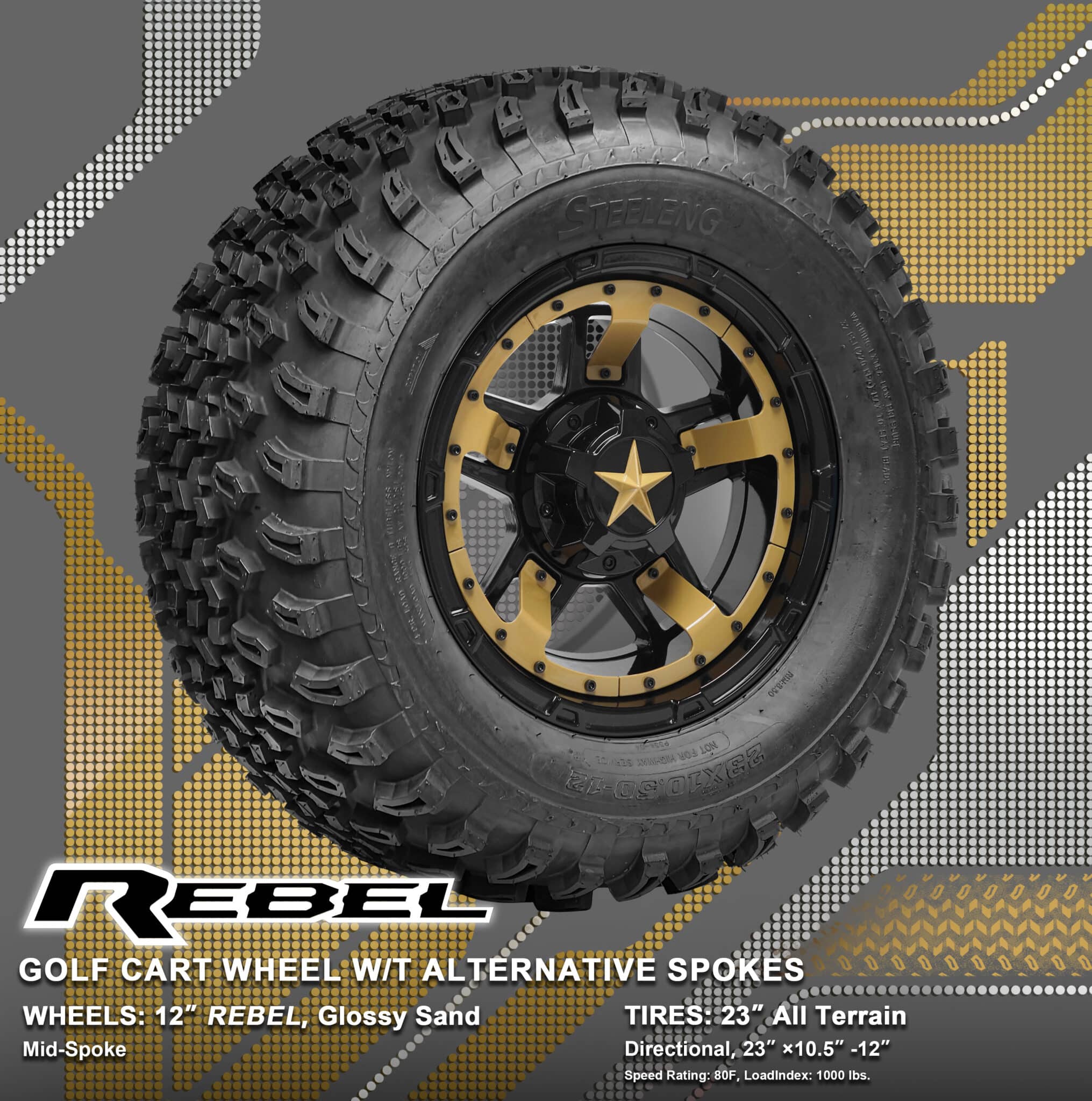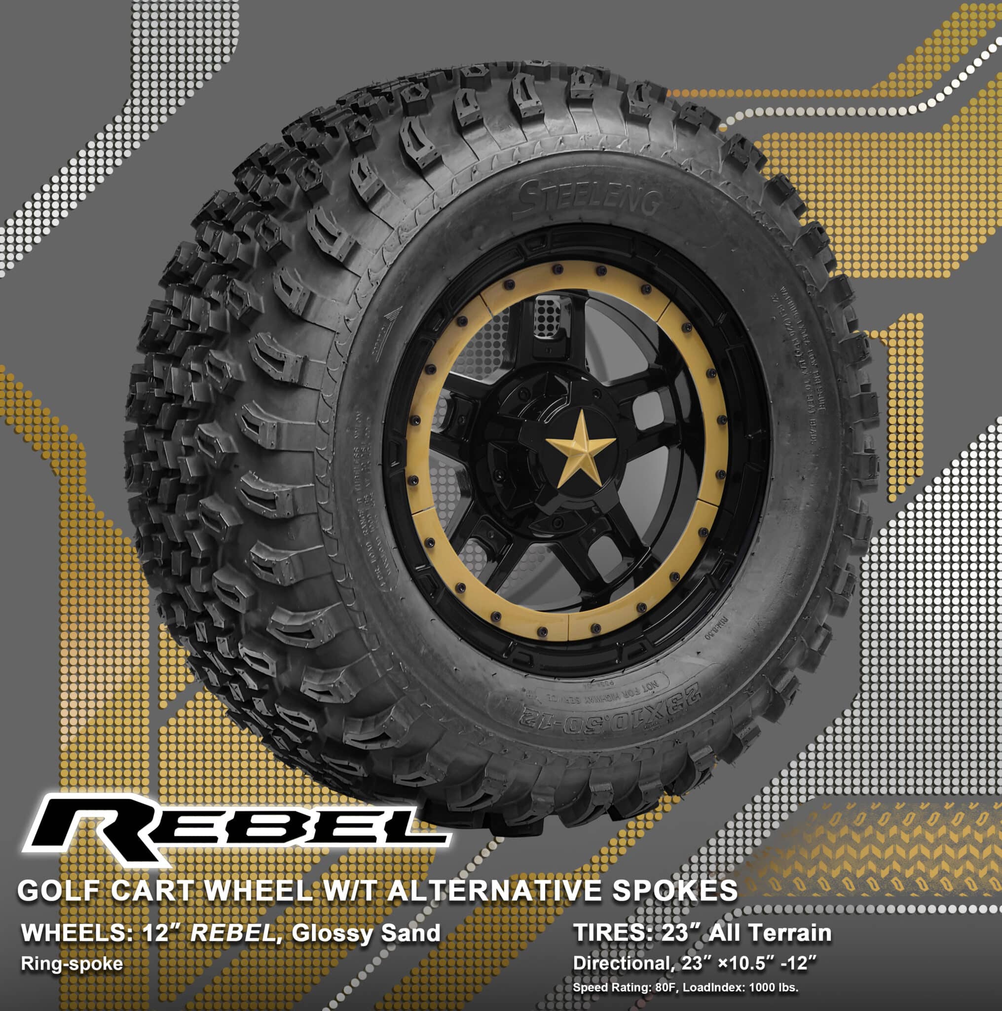 BNDL-TR1205-WH1251-WIRB09-LN0002 – SGC 12″ REBEL Glossy Black Wheel – Aluminum Alloy / STEELENG 23″x10.5″-12″ All Terrain Tire / REBEL Inserts-Mid Spoke-Glossy Sand