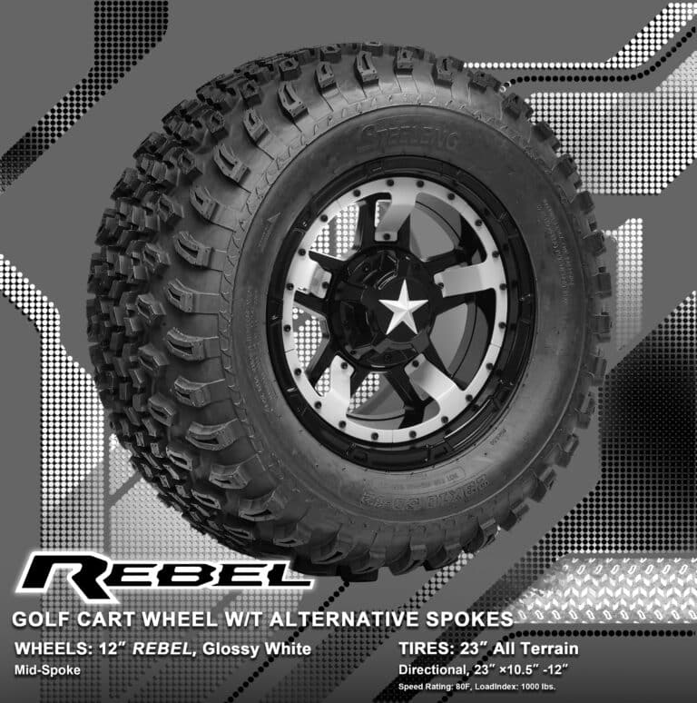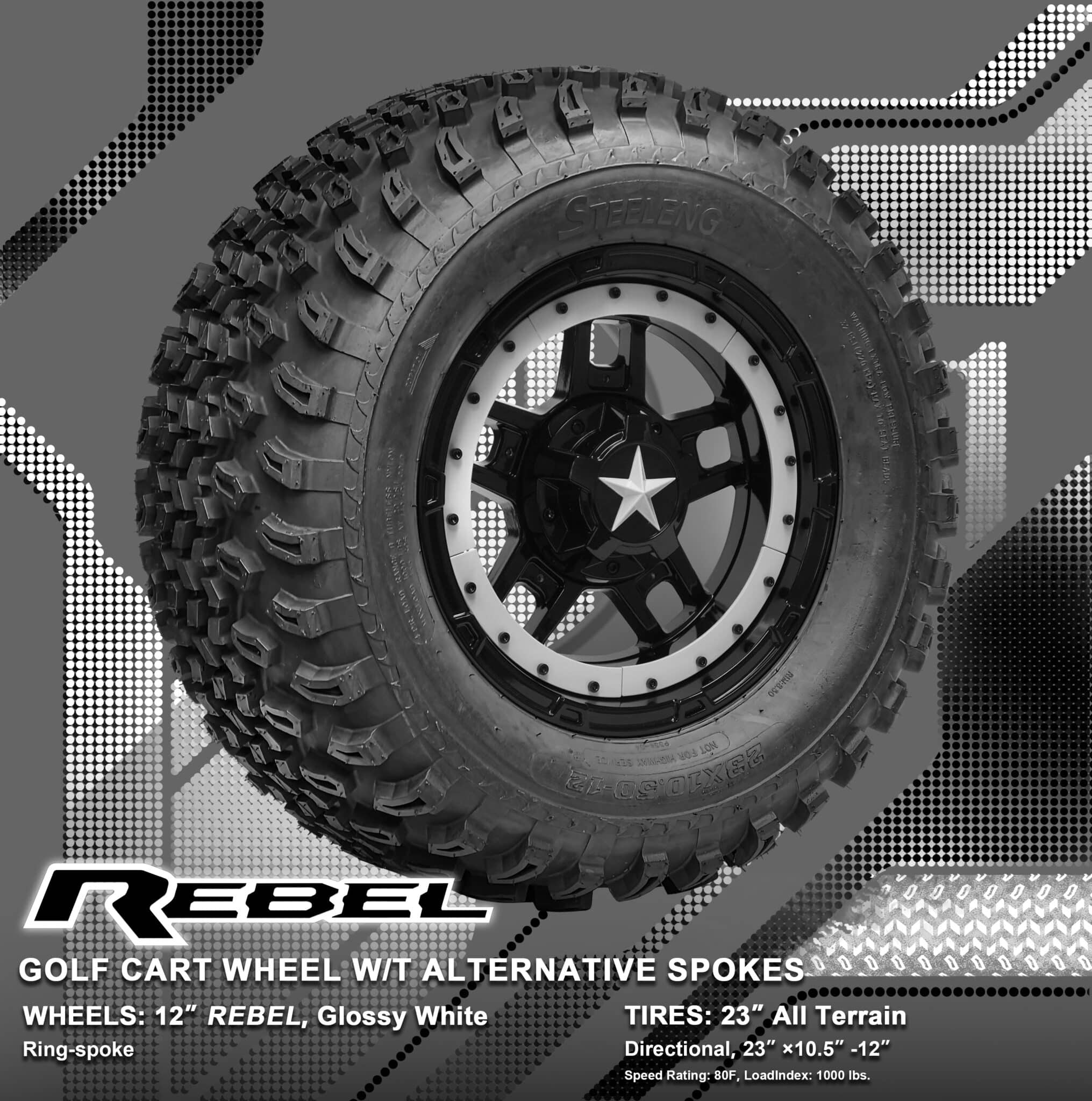 BNDL-TR1205-WH1251-WIRB10-LN0002 – SGC 12″ REBEL Glossy Black Wheel – Aluminum Alloy / STEELENG 23″x10.5″-12″ All Terrain Tire / REBEL Inserts-Mid Spoke-Glossy White