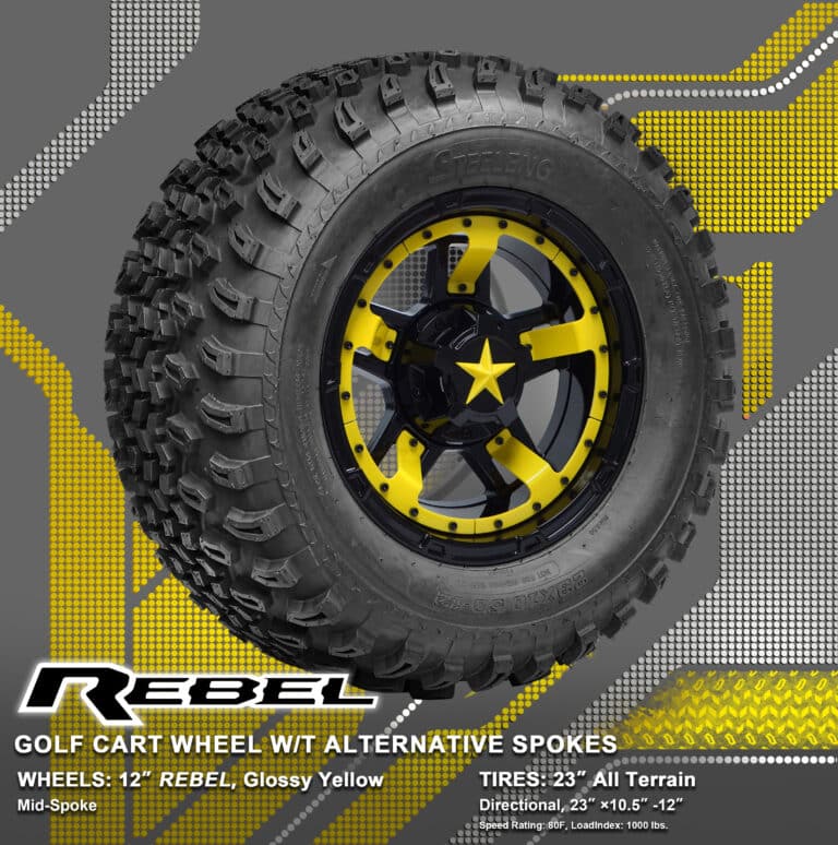 BNDL-TR1205-WH1251-WIRB11-LN0002 – SGC 12″ REBEL Glossy Black Wheel – Aluminum Alloy / STEELENG 23″x10.5″-12″ All Terrain Tire / REBEL Inserts-Mid Spoke-Glossy Yellow