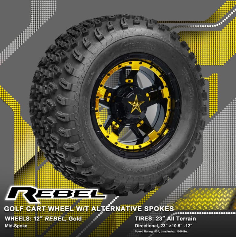 BNDL-TR1205-WH1251-WIRB12-LN0002 – SGC 12″ REBEL Glossy Black Wheel – Aluminum Alloy / STEELENG 23″x10.5″-12″ All Terrain Tire / REBEL Inserts-Mid Spoke-Gold