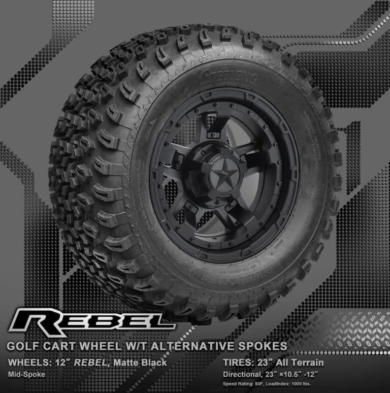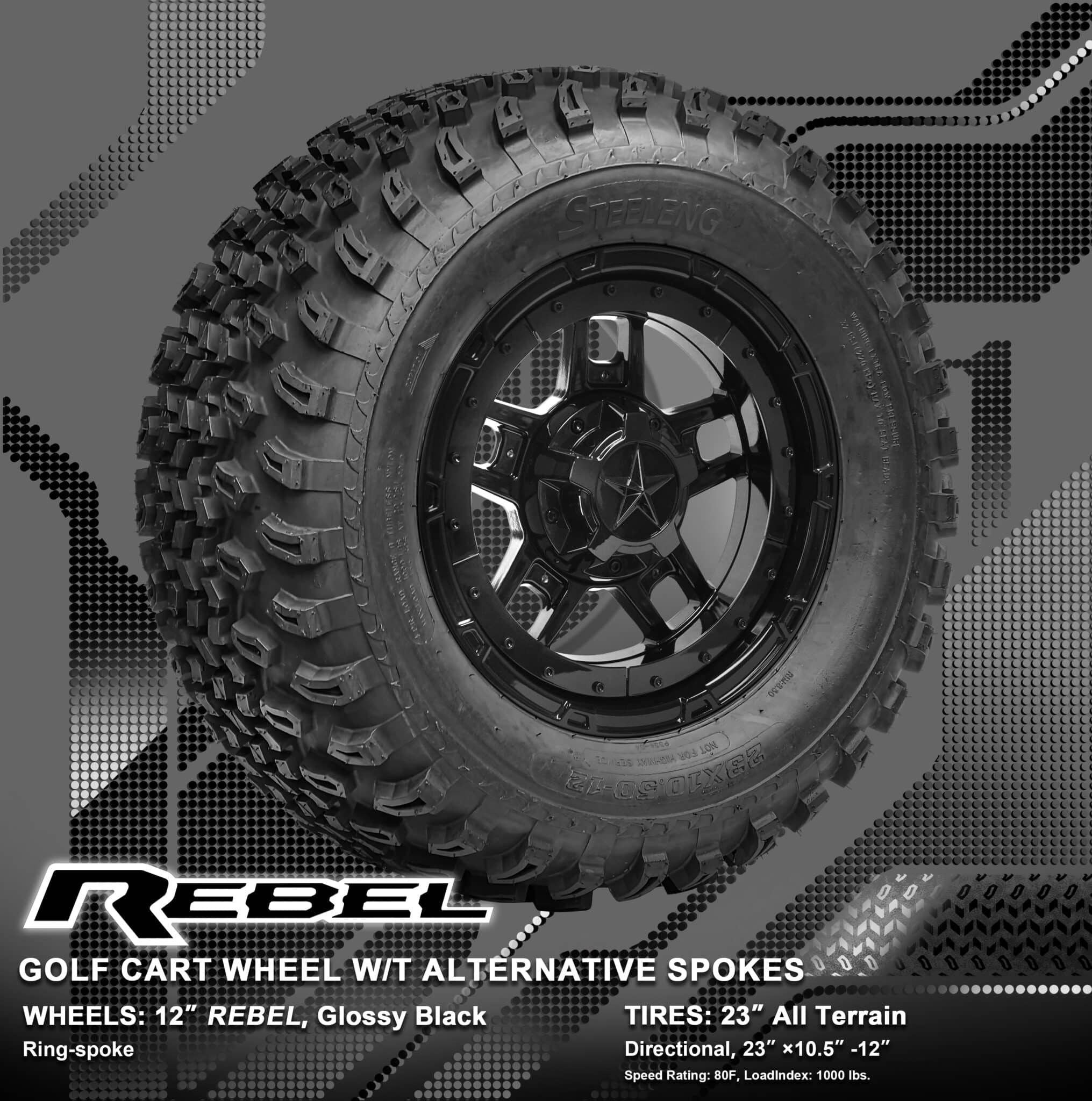BNDL-TR1205-WH1251-WIRB13-LN0002 – SGC 12″ REBEL Glossy Black Wheel – Aluminum Alloy / STEELENG 23″x10.5″-12″ All Terrain Tire / REBEL Inserts-Mid Spoke-Matte Black