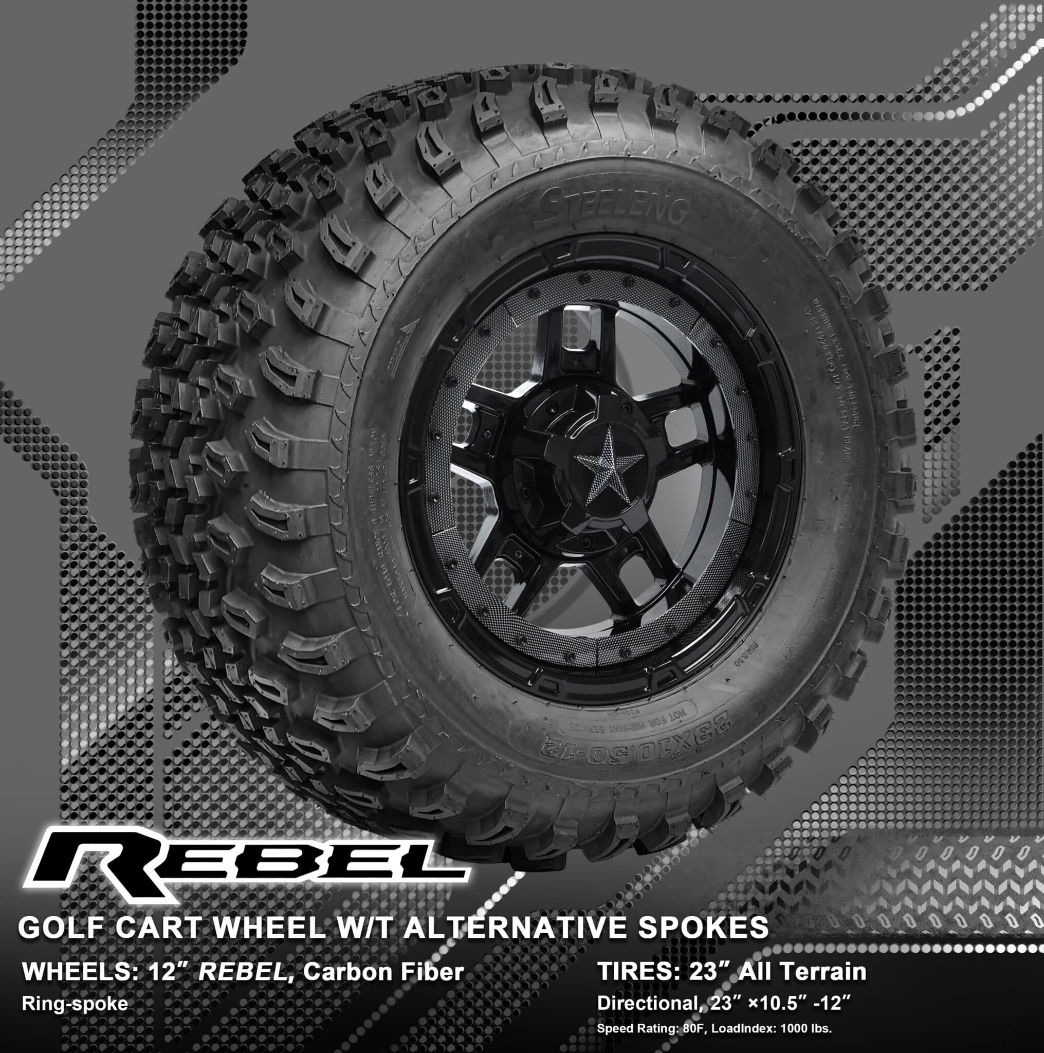 BNDL-TR1205-WH1251-WIRB14-LN0002 – SGC 12″ REBEL Glossy Black Wheel – Aluminum Alloy / STEELENG 23″x10.5″-12″ All Terrain Tire / REBEL Inserts-Ring-Carbon Fiber