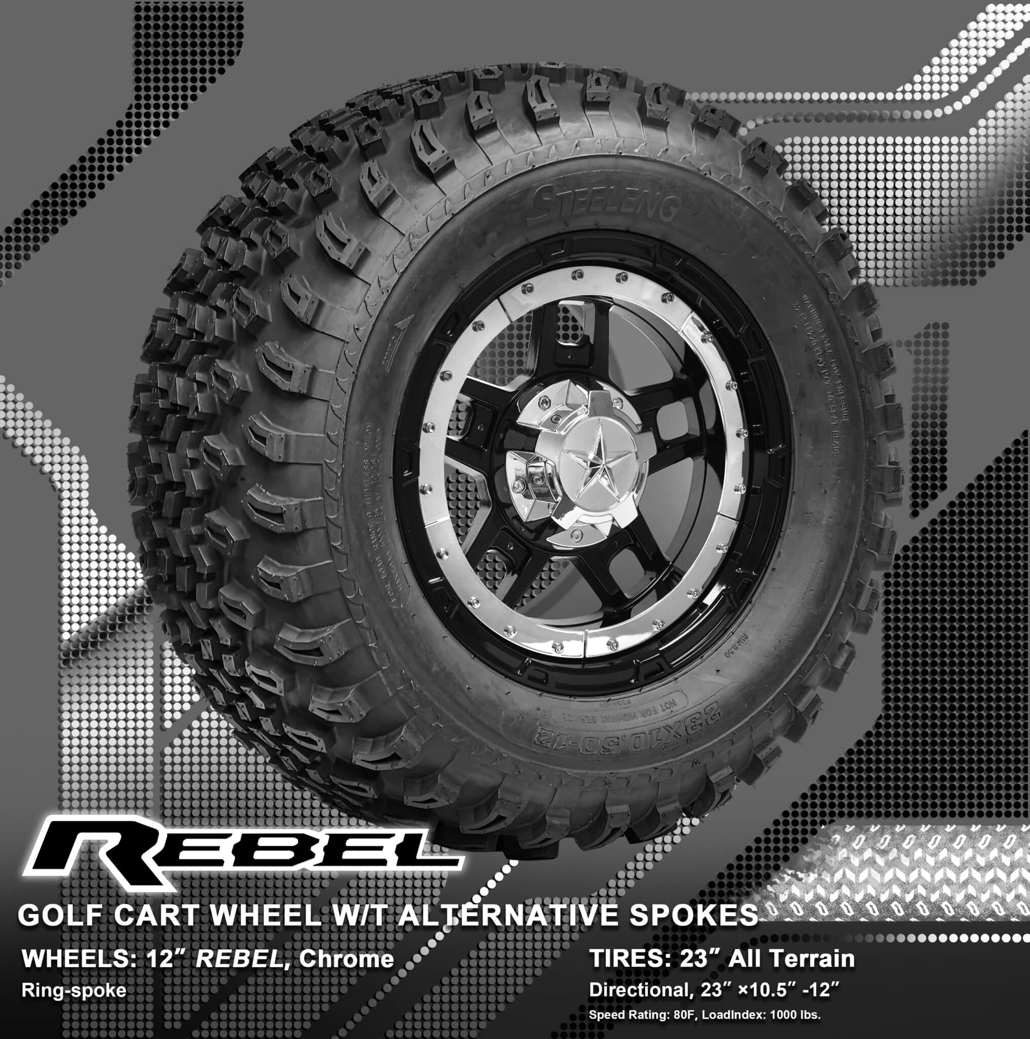 BNDL-TR1205-WH1251-WIRB15-LN0002 – SGC 12″ REBEL Glossy Black Wheel – Aluminum Alloy / STEELENG 23″x10.5″-12″ All Terrain Tire / REBEL Inserts-Ring-Chrome