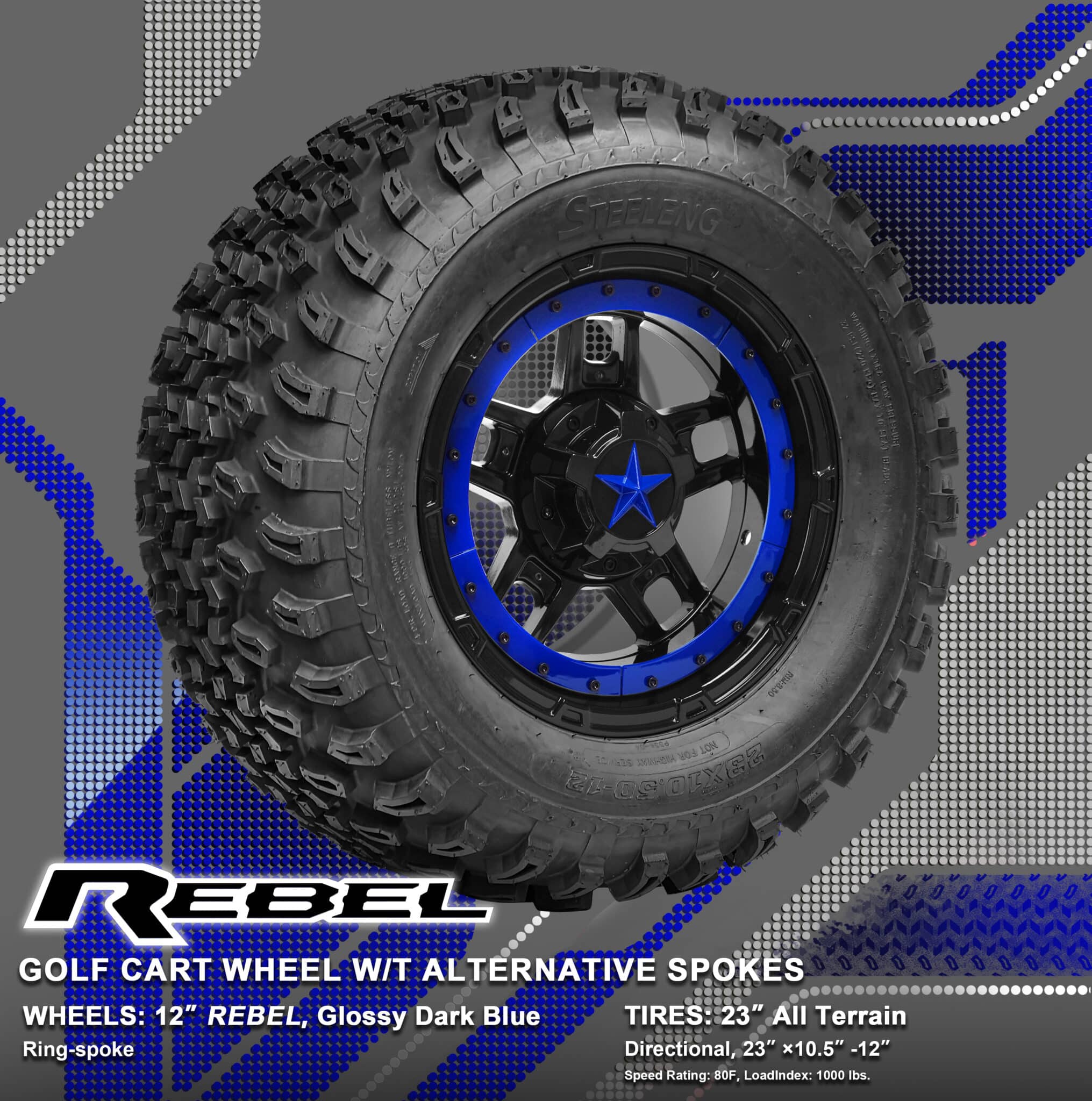 BNDL-TR1205-WH1251-WIRB17-LN0002 – SGC 12″ REBEL Glossy Black Wheel – Aluminum Alloy / STEELENG 23″x10.5″-12″ All Terrain Tire / REBEL Inserts-Ring-Glossy Dark Blue