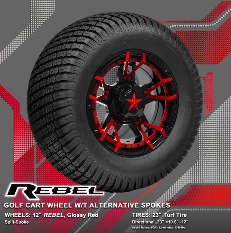 BNDL-TR1206-WH1251-WIRB34-LN0002 – SGC 12″ REBEL Glossy Black Wheel – Aluminum Alloy / STEELENG 23″x10.5″-12″ Turf Tire / REBEL Inserts-Split Spoke-Glossy Red