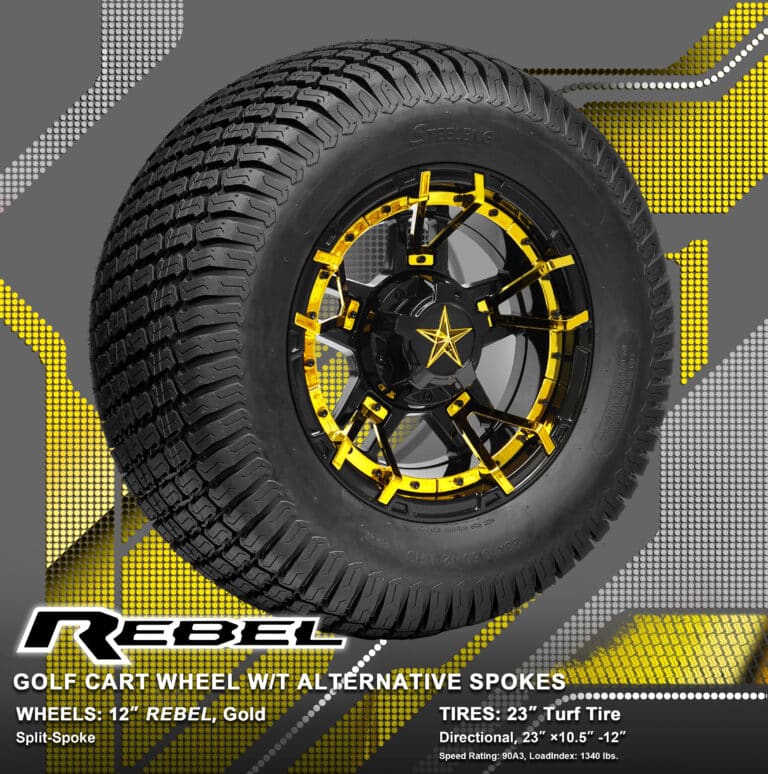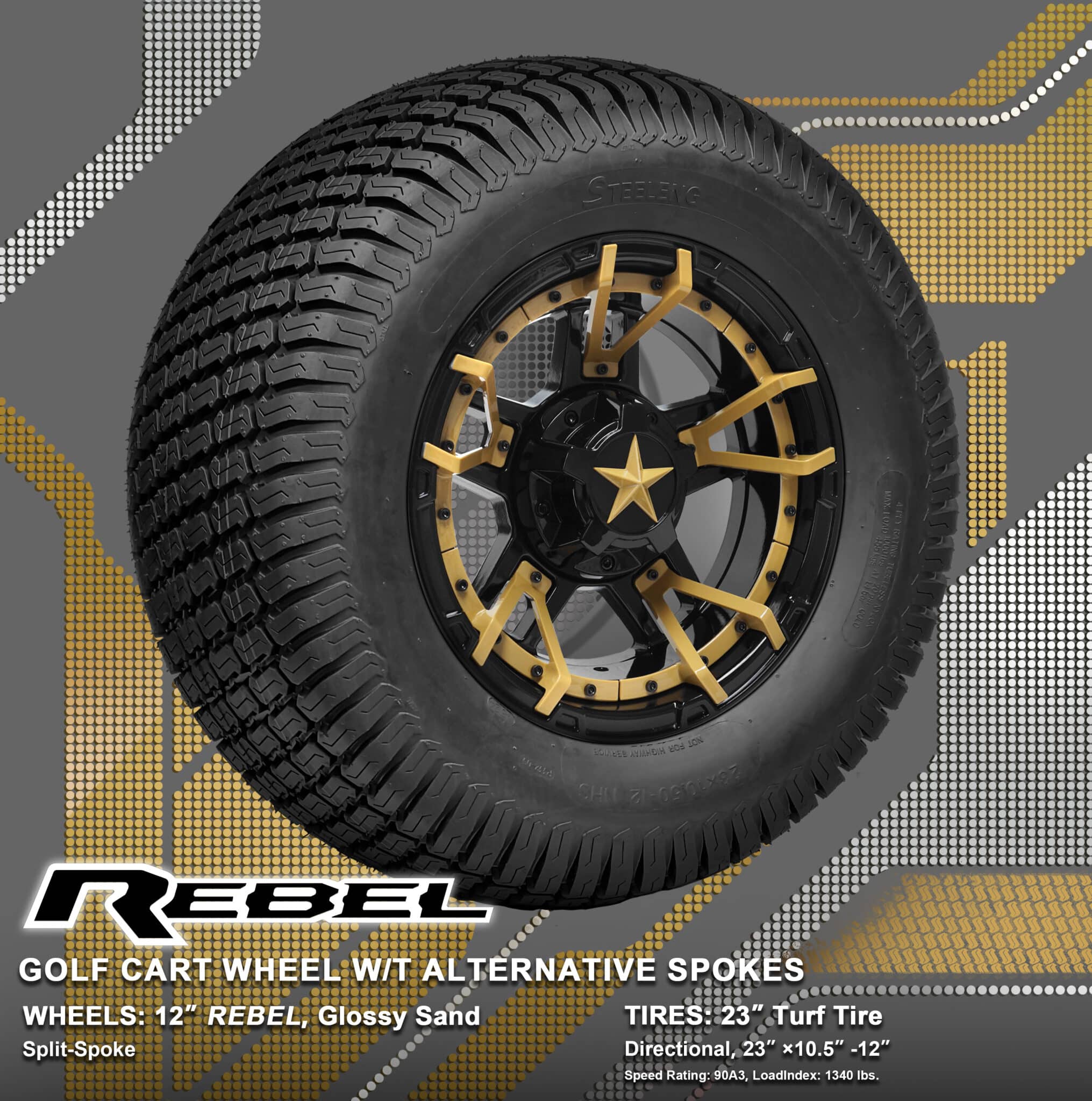 BNDL-TR1206-WH1251-WIRB38-LN0002 – SGC 12″ REBEL Glossy Black Wheel – Aluminum Alloy / STEELENG 23″x10.5″-12″ Turf Tire / REBEL Inserts-Split Spoke-Gold