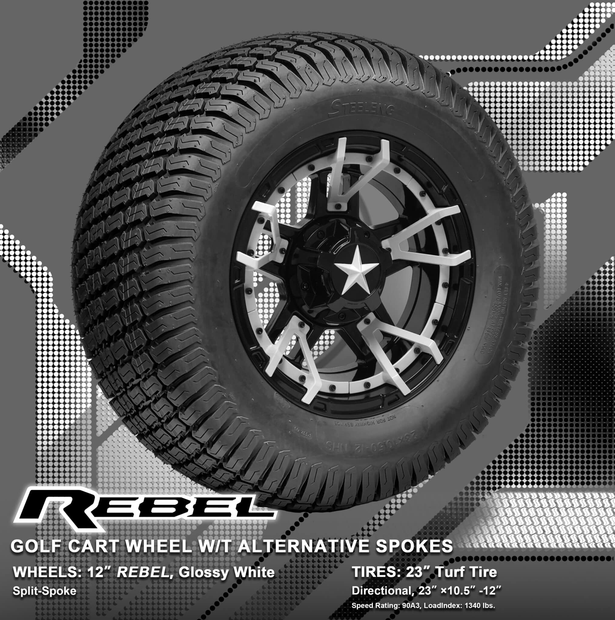 BNDL-TR1206-WH1251-WIRB36-LN0002 – SGC 12″ REBEL Glossy Black Wheel – Aluminum Alloy / STEELENG 23″x10.5″-12″ Turf Tire / REBEL Inserts-Split Spoke-Glossy White